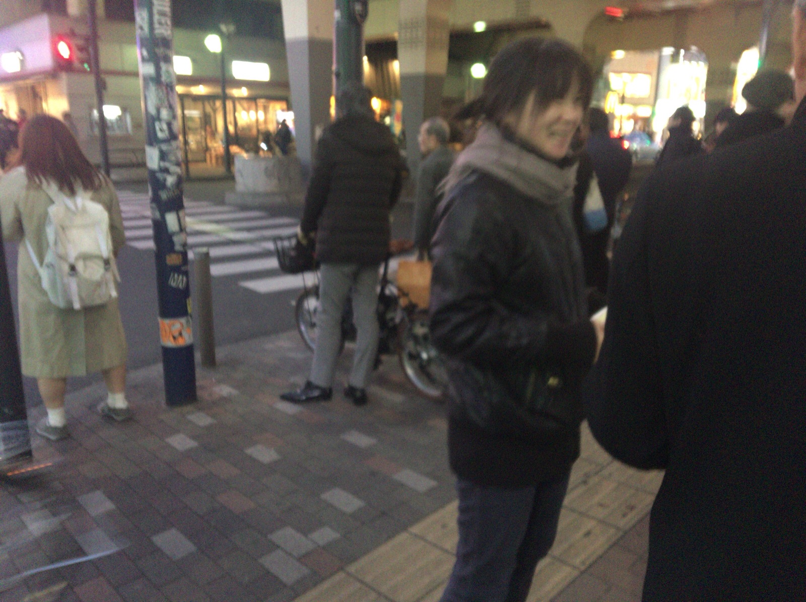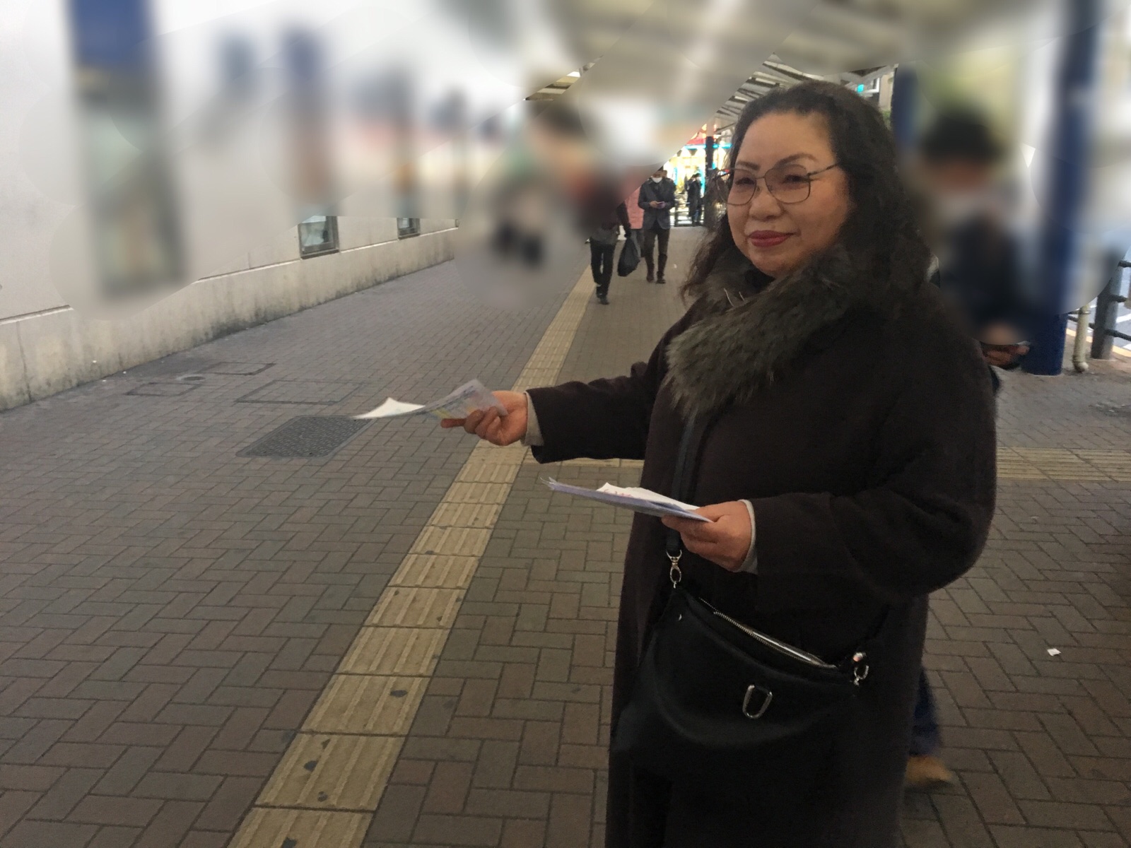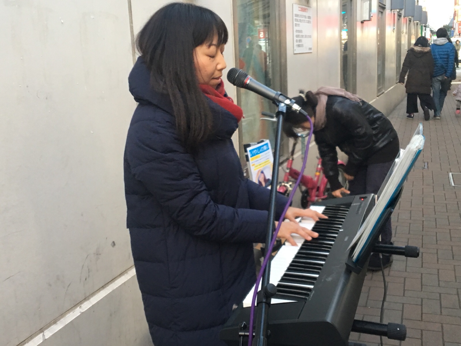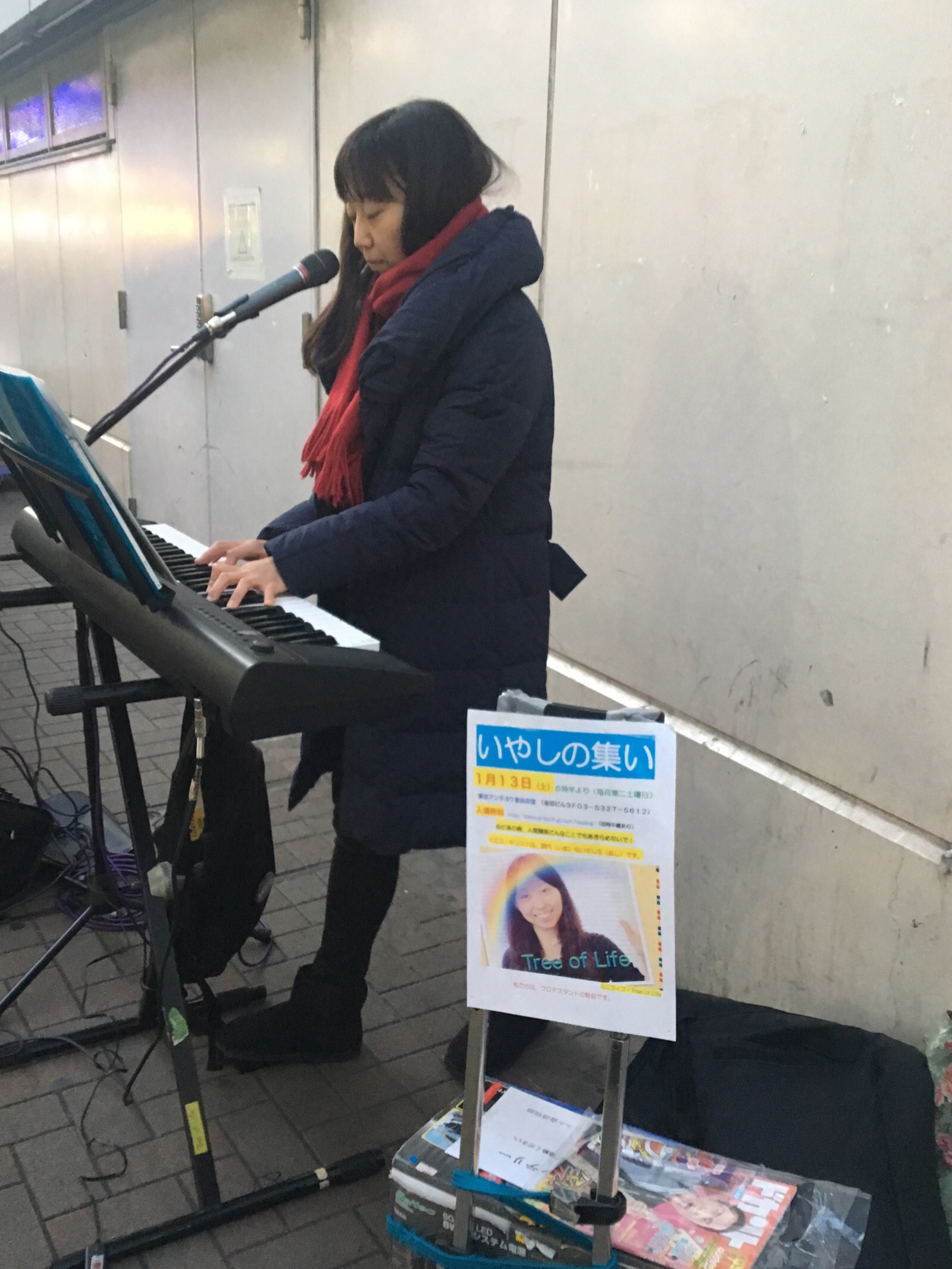高円寺南口駅前で、いやしの集いの宣伝路上ライブが行われています!始めの曲は、花♪エステル清水