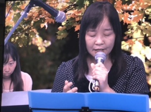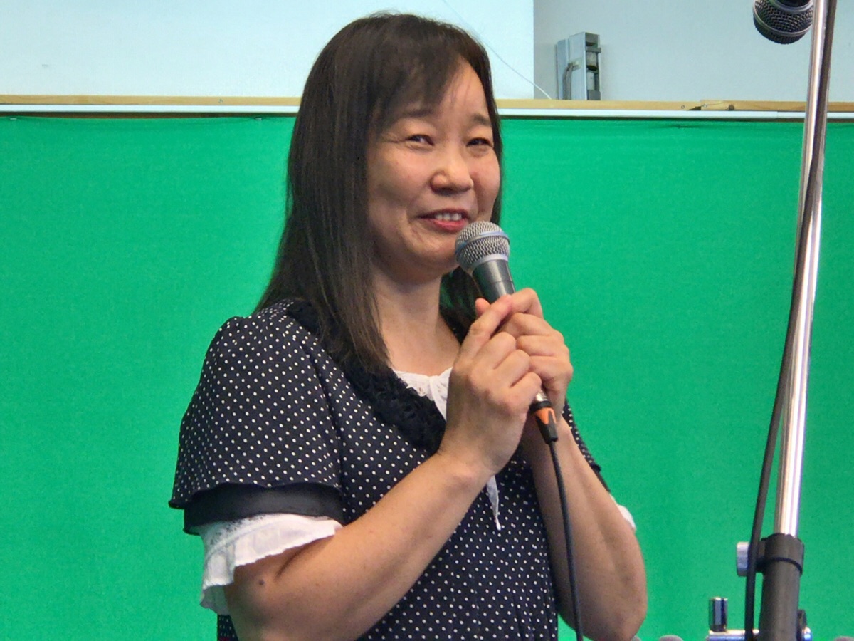 益川さんが、お祖父様が神さまによって癒された体験談を話しておられます。 隣に立つのは、手話通訳者の星野さん。