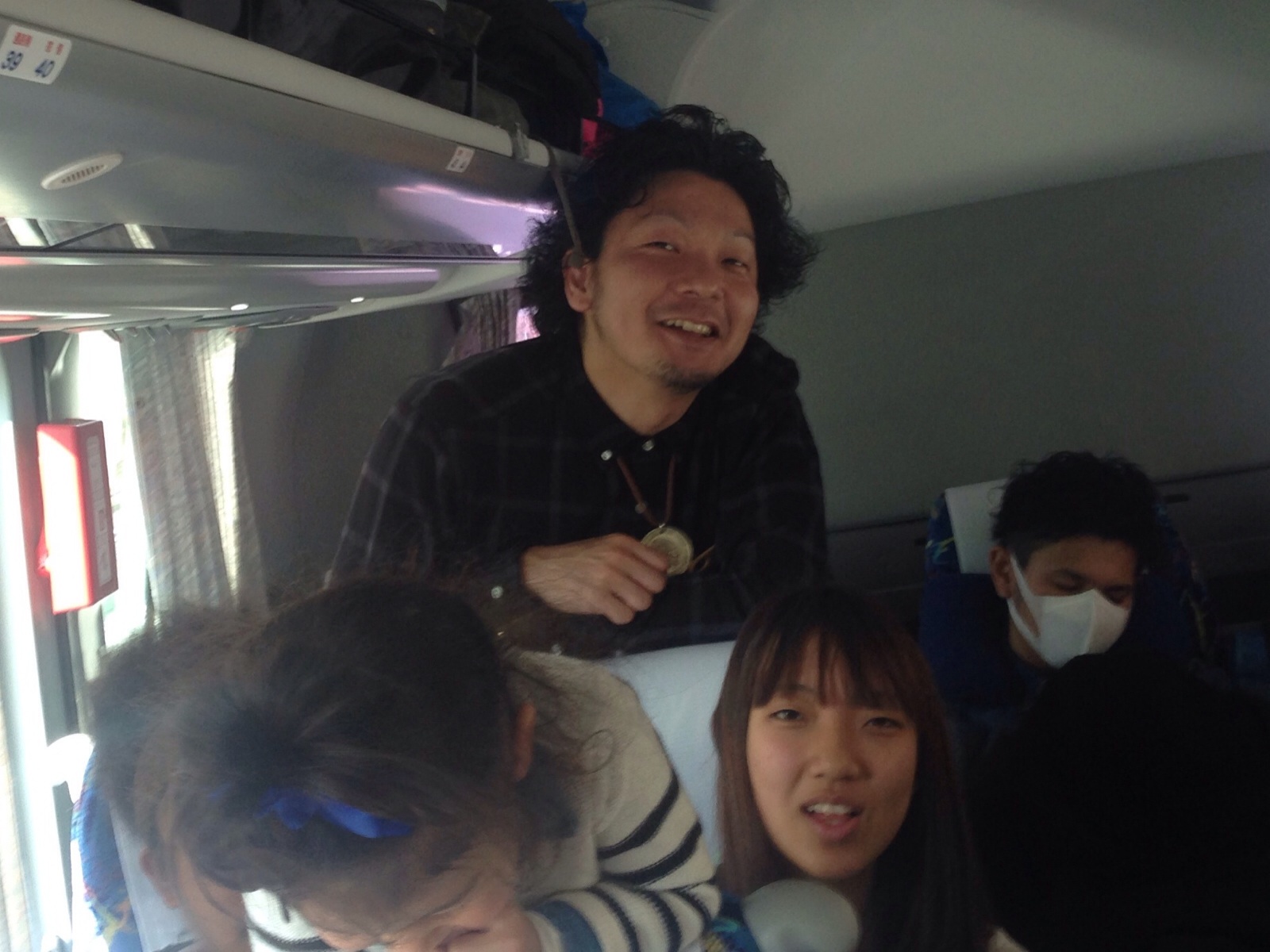 関西バスです。どこかのサービスエリアです。写真は前田さん。バスで礼拝が始まりました。では、 大阪ya