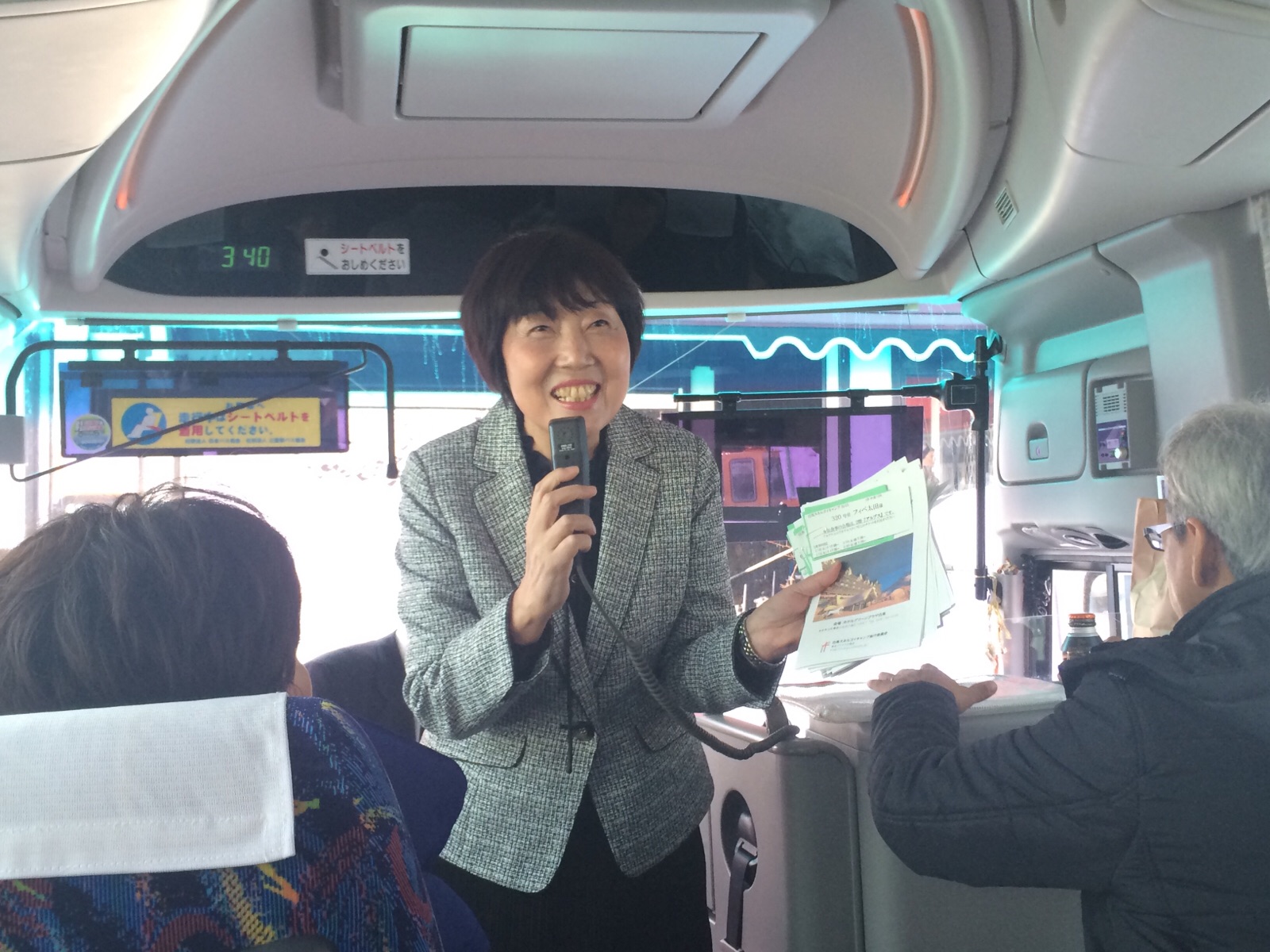 榊さんがバスの中でチェックインの対応をしてくださっています! 四日市シオン教会