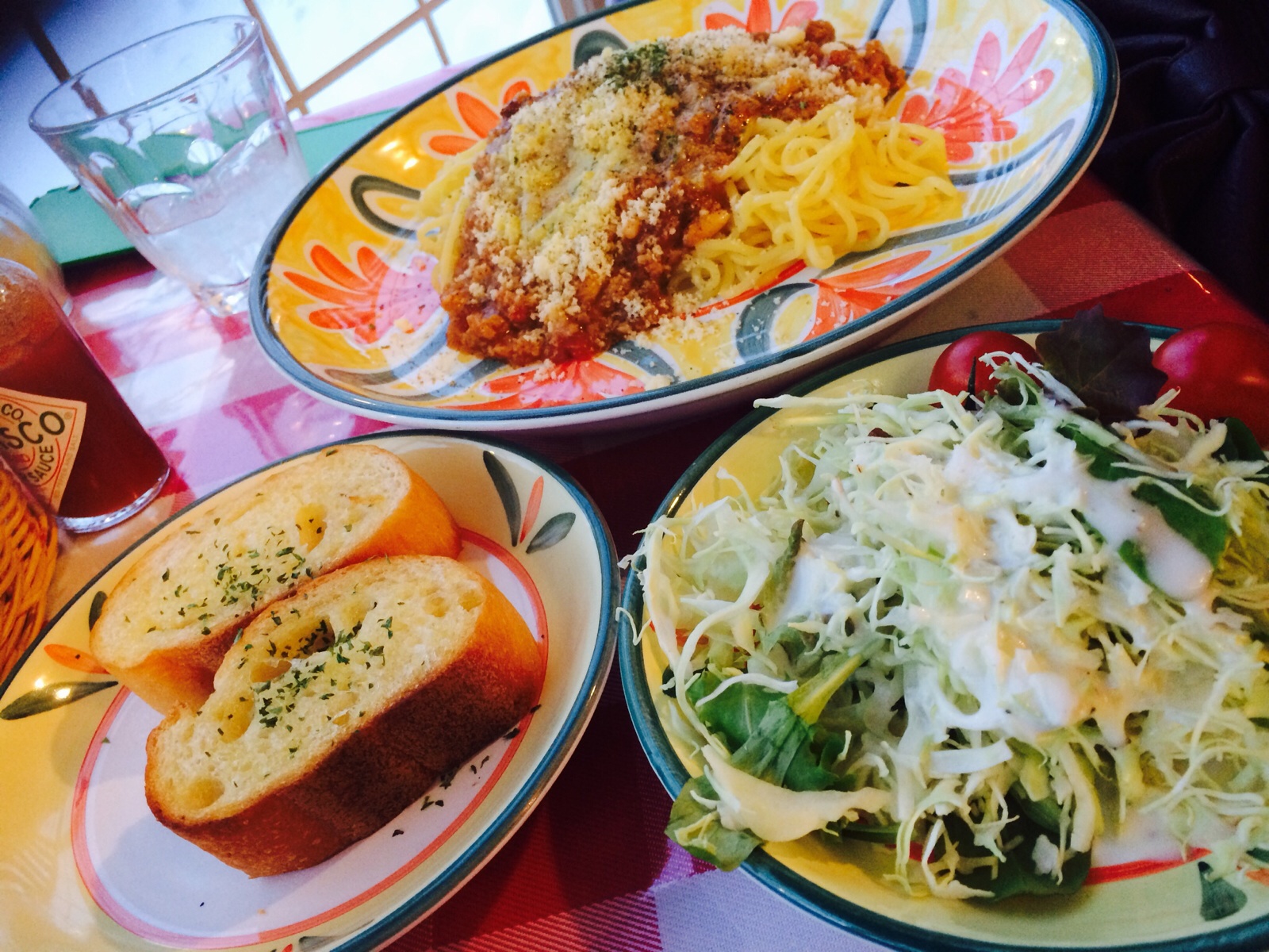母はラグーソースのパスタ! サラダとガーリックトーストも付きます(≧∇≦) 神戸shion