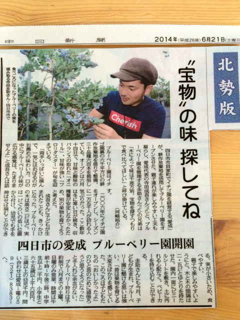 今朝の中日新聞で愛成ブルーベリーが紹介されました!こちらの方では、ほとんどの方が中日新聞を読まれているので宣伝効果は抜群です。ブルーベリー事業はまだまだ知名度が低くお客さんが少なく厳しい状況なので凄く凄く助かります。皆様のとりなしの祈り感謝致します。