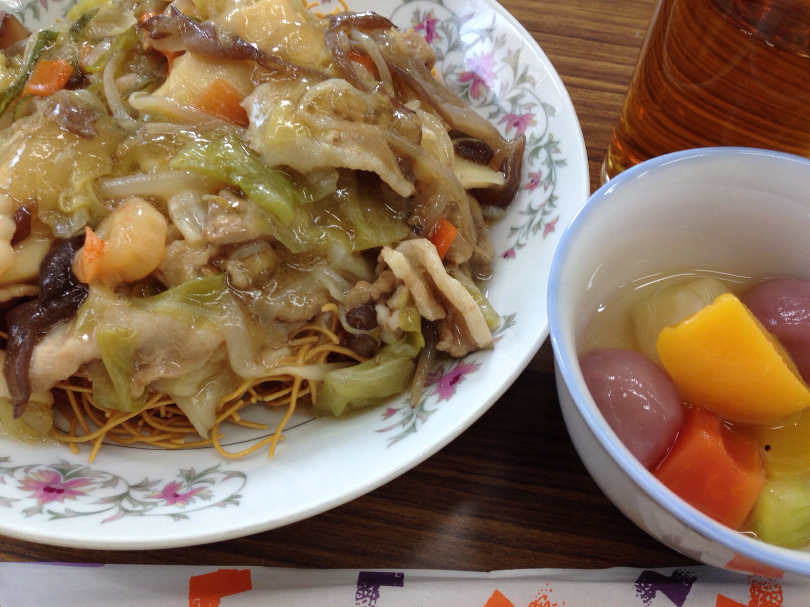 婦人会に顔を出してきました。 パリパリ皿うどんとデザートのフルーツ白玉です。 もちろん美味しかったです!