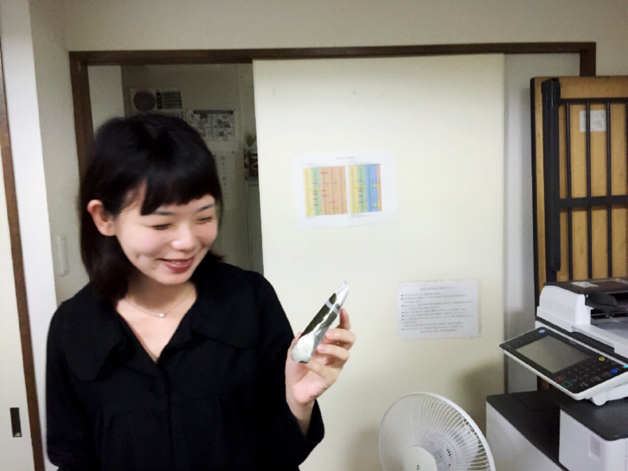 ぺったんこになったツナマヨおにぎりを手にするりょうこちゃん。 横顔がせつなそうです(⁉︎) やまなか