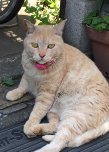 うちの側の猫ちゃん。ピンクののみとりバンドが素敵。前にいたうちのマロ、ジロも、してました。でも、生き物のみとか多少のストレスひつようだって。ono