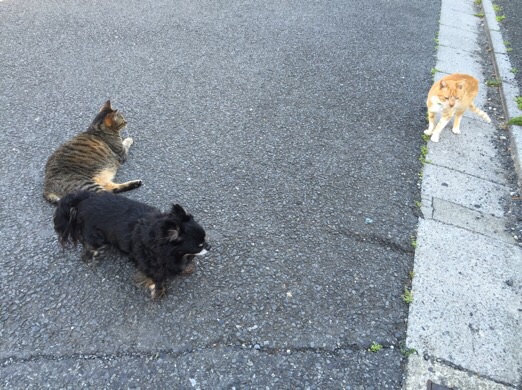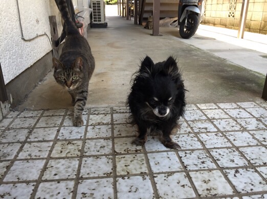 辻郷家のチビちゃん、ギデオンくん。犬猫で仲良くさんぽ中。