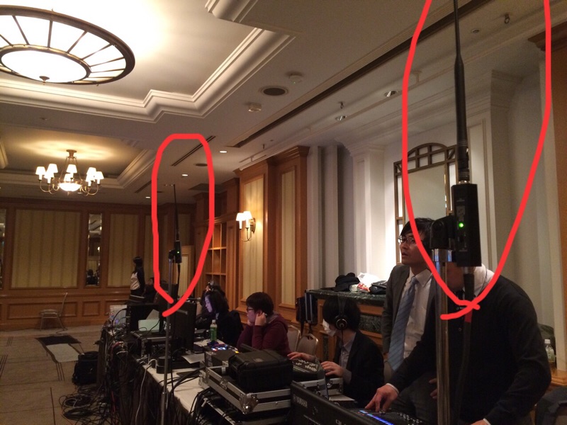ちょっとわかりにくいですが、PA席の前に立っている2本の角みたいなのは、ワイヤレスマイクのアンテナです。