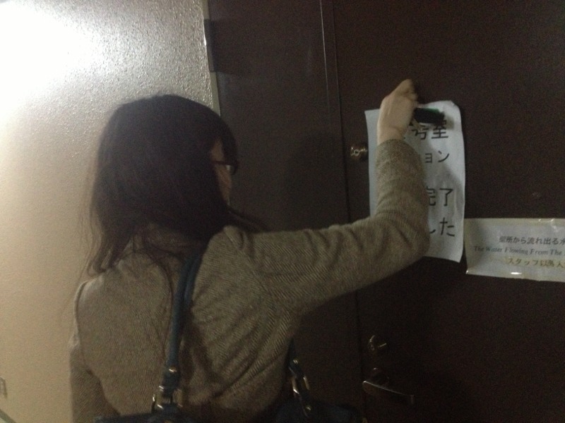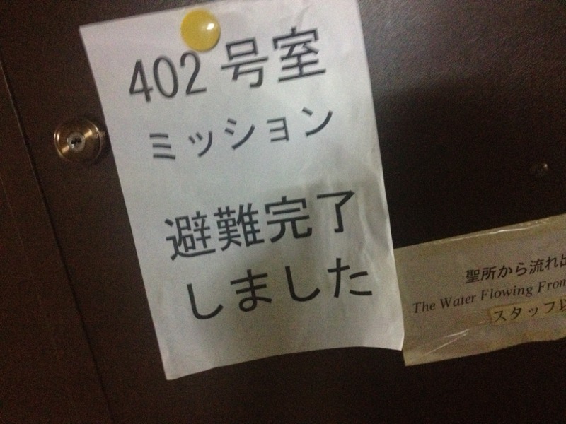 時間がきたので、避難を開始します。避難完了の表示をドアに貼り付けます! アマガイ