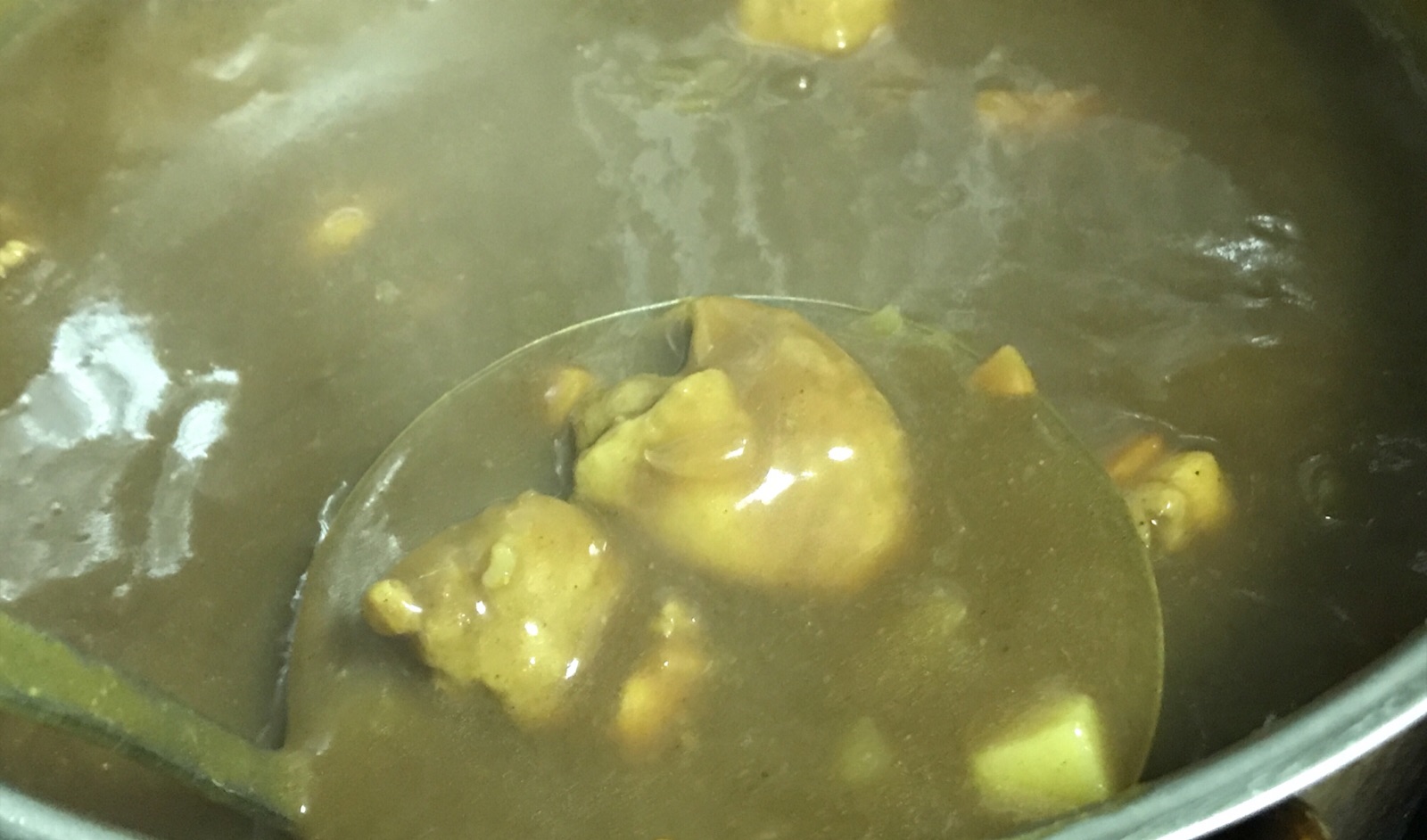 夕飯のカレー、辛口ルーも混ぜたので辛いけど空腹なので食べてるそうです。