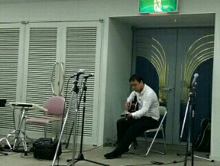 PAのために東京から来た前田さんが、お昼休みにギター弾いてます。