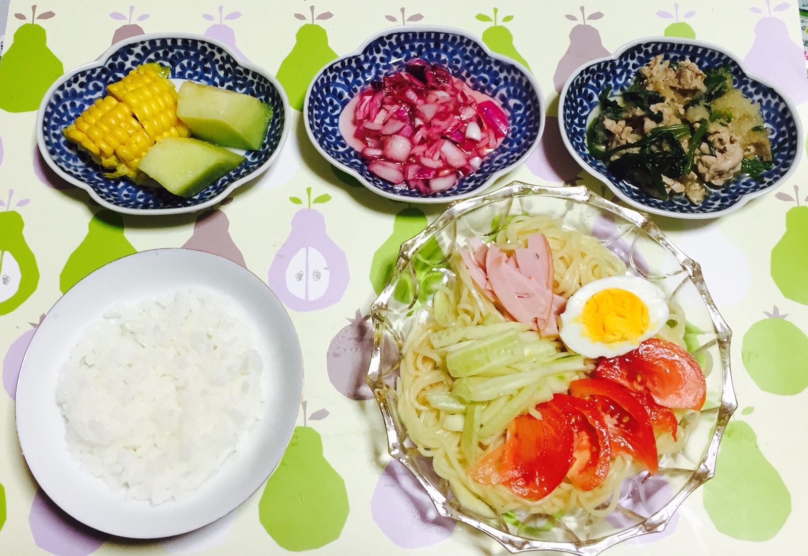 とうもろこし&メロン、酢玉ねぎ、豚肉とほうれん草の大根おろし和え、ご飯、冷やし中華☺︎ 神のしもべ長崎教会 望