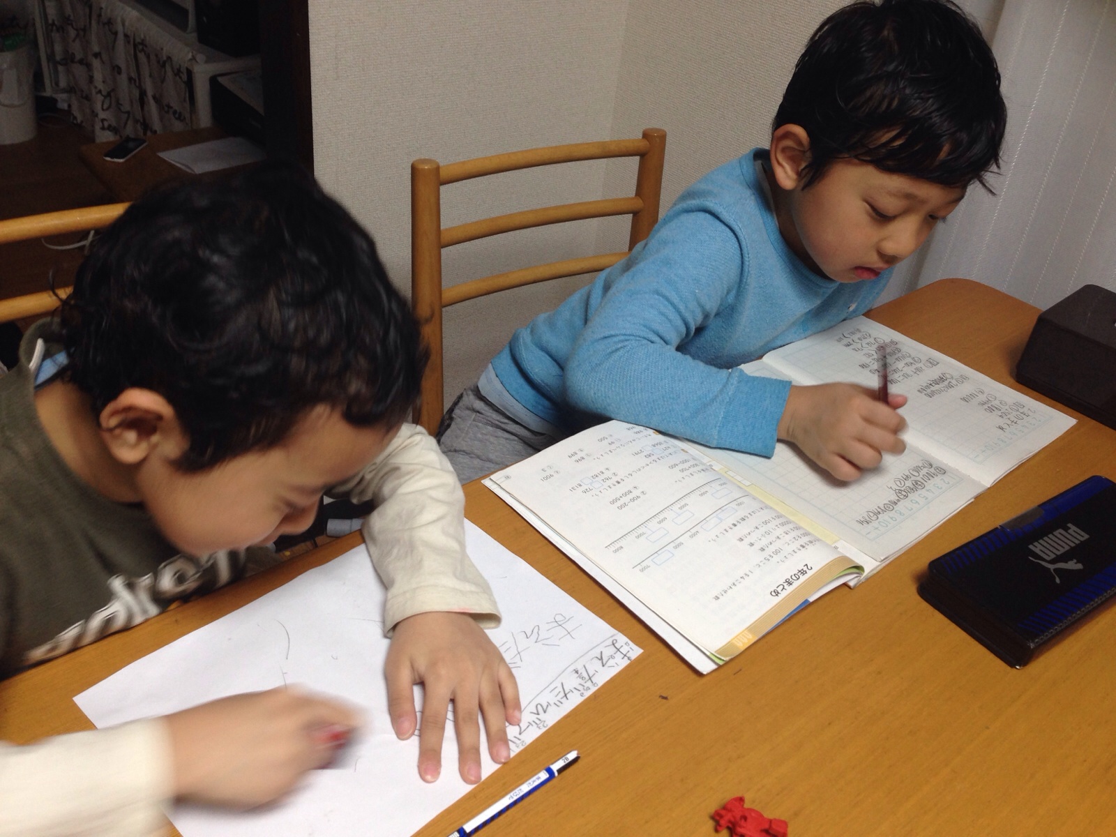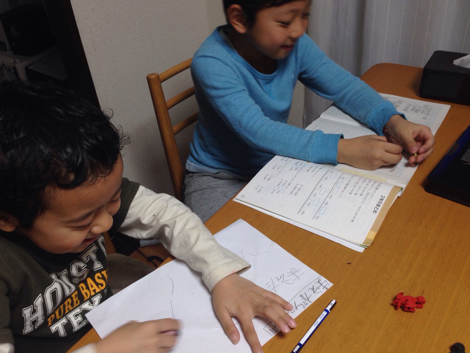 長男は学校の宿題、次男はひらがなの練習中。三男は気ままに遊び中☆ Truth Akemi