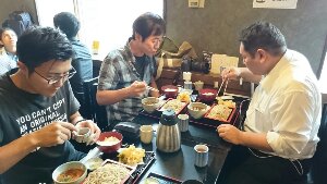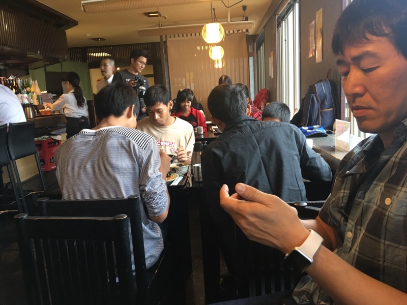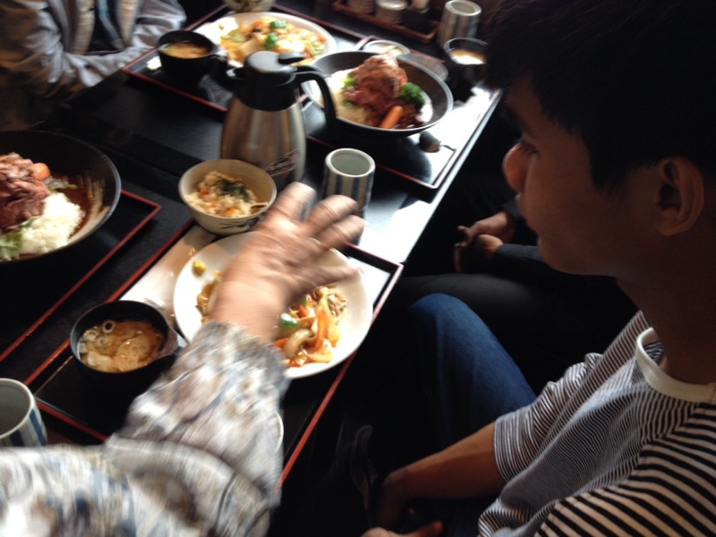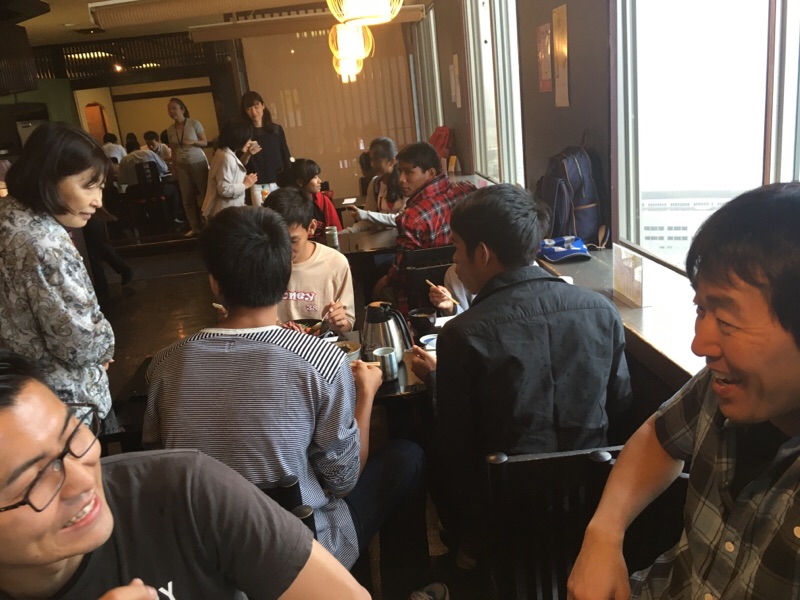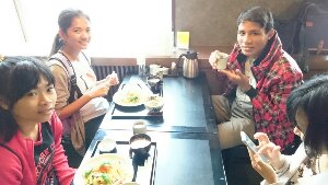 女の子達も、食べ始めています! あら?! お茶の湯呑みの正しい持ち方(?!)を、心得ている方も おられます♪ Megumi