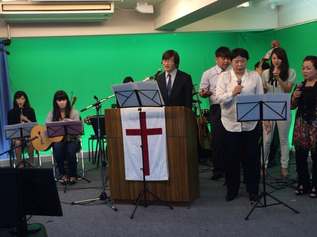 奥では、牧師賛美のクワイアとオーケストラがスタンバイ中です。