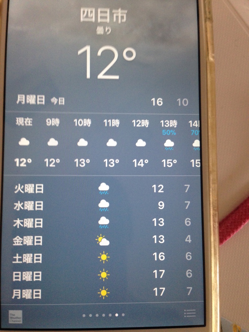 今朝の天気は曇り!明日からの天気予報は雨模様お天気守られますように。