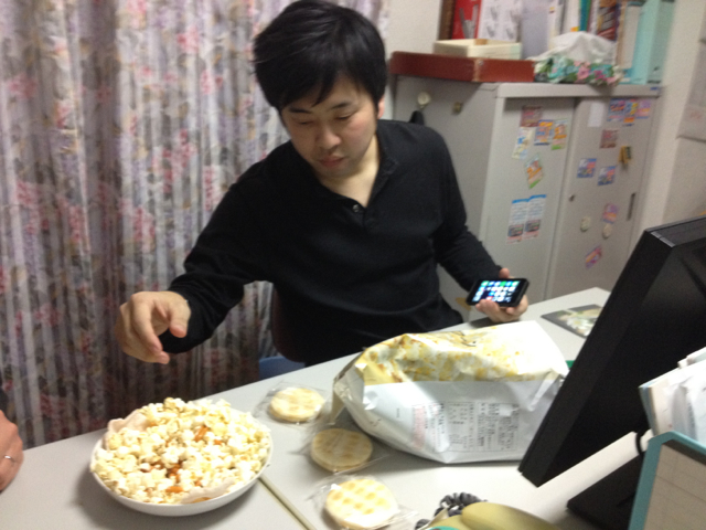 笠原牧師の好物、柿の種載せポップコーン。