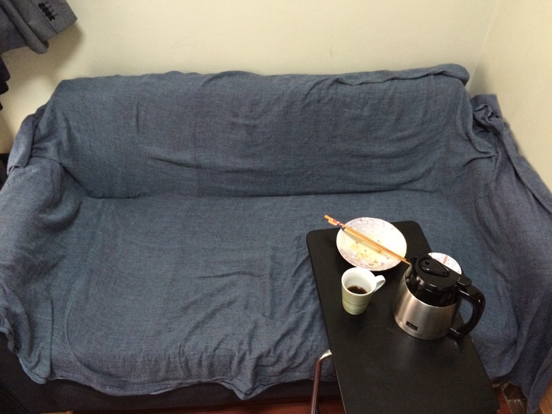 机の下に寝具がある理由。 それは、写真のソファーがソファーベットだからです。 このシステムのおかげで、スペースを広く取れるようになりました。 映像部ひかる