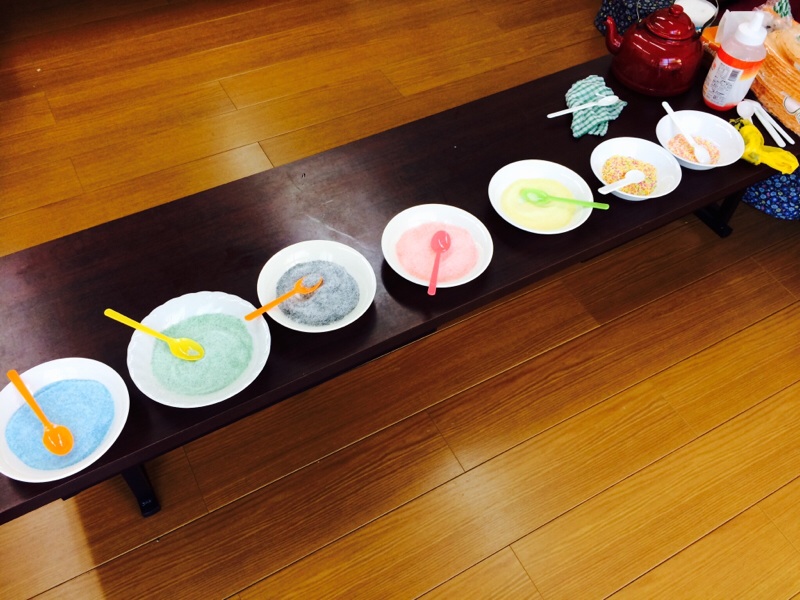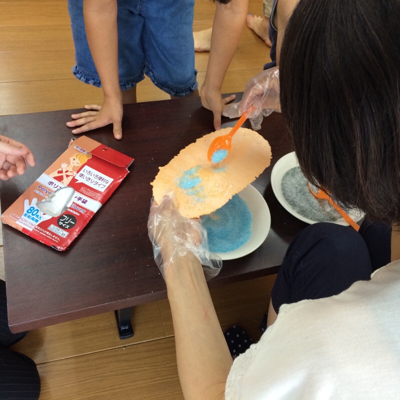 綿棒でたこせんにお絵かきします。 これはトッピングするお砂糖たち。 CSスタッフ