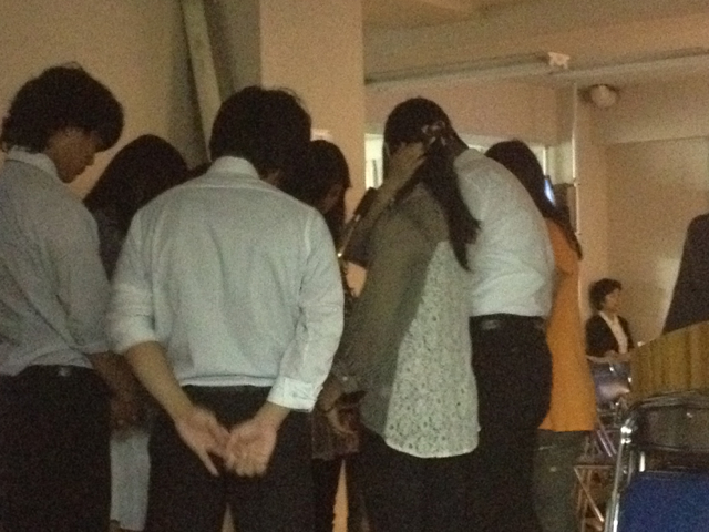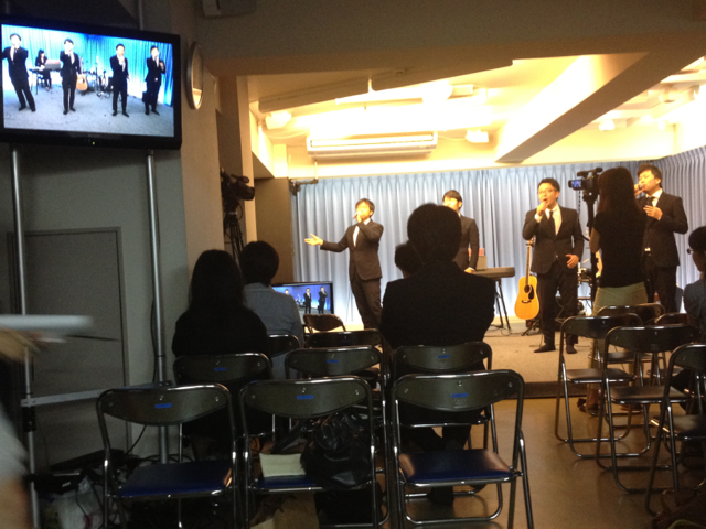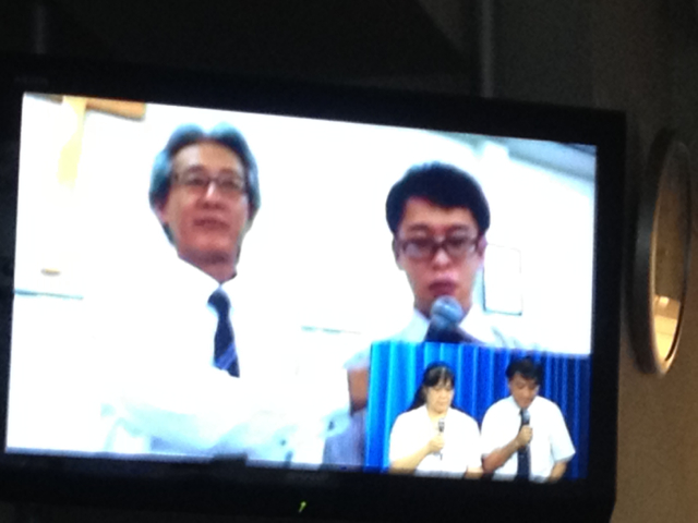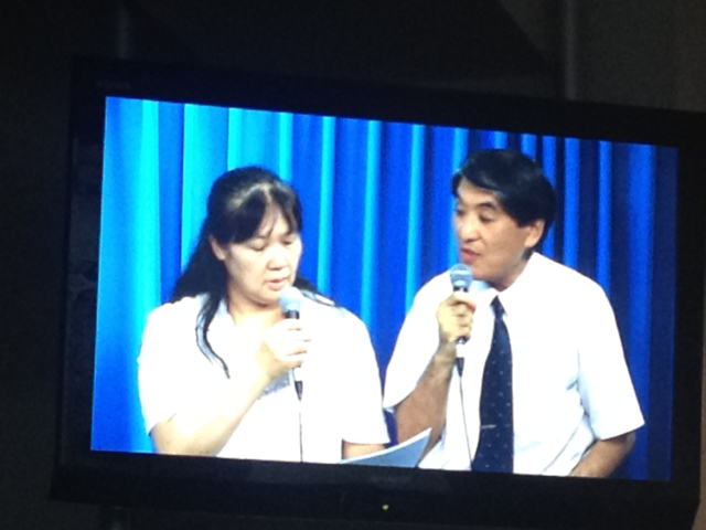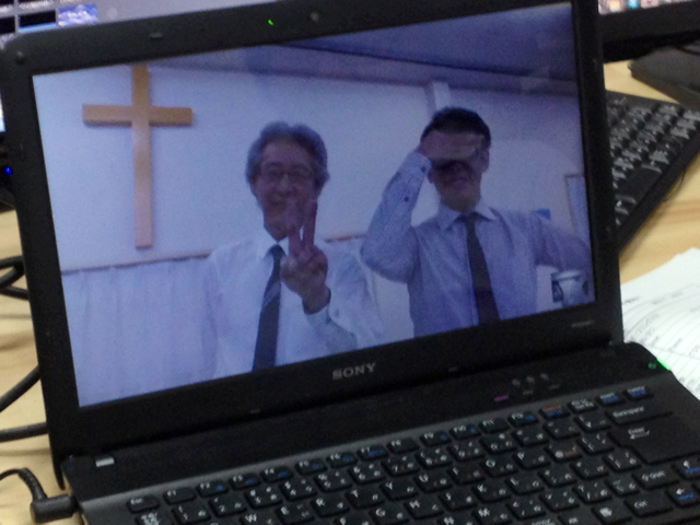 本番前に四日市の山下牧師たちが映っている画面を他のモニターと同じつもりでガン見していたら、それはスカイプでつないでいるPCでした~。あちらにはこちらの顔が~。失礼しました~。