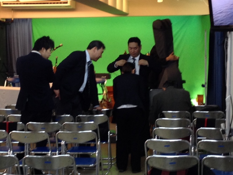 後ろで礼拝準備中です。