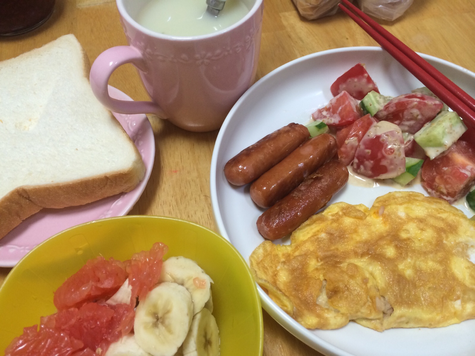 朝、食べてないので、朝食のようなお昼を食べてます。 Kayano