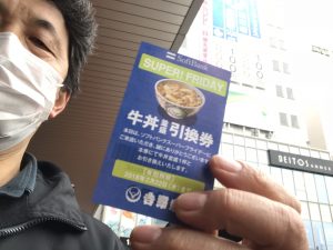 あまりの混み方に諦めていましたが、作戦を変え、バイト先の近くで牛丼クーポン券をゲット。博多駅には吉野家が3店あります。顔が険しい。笑 福岡 kosuda
