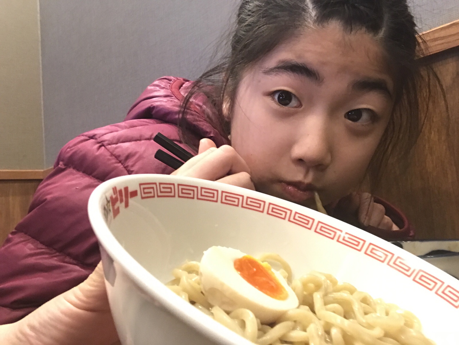映画終わって、ラーメン屋さんに来ています。娘は昨日の卒業式からの疲れがでている模様。。。