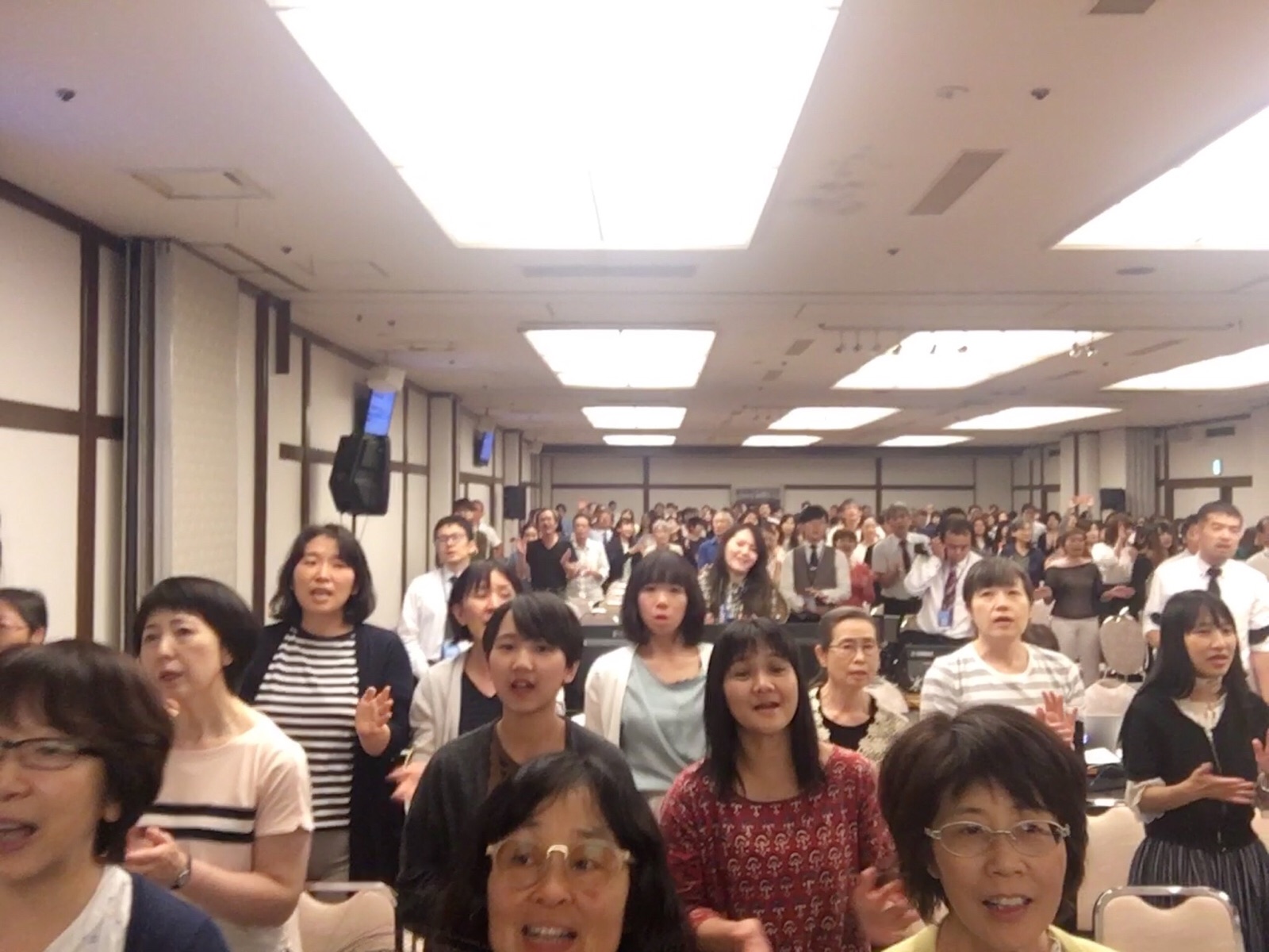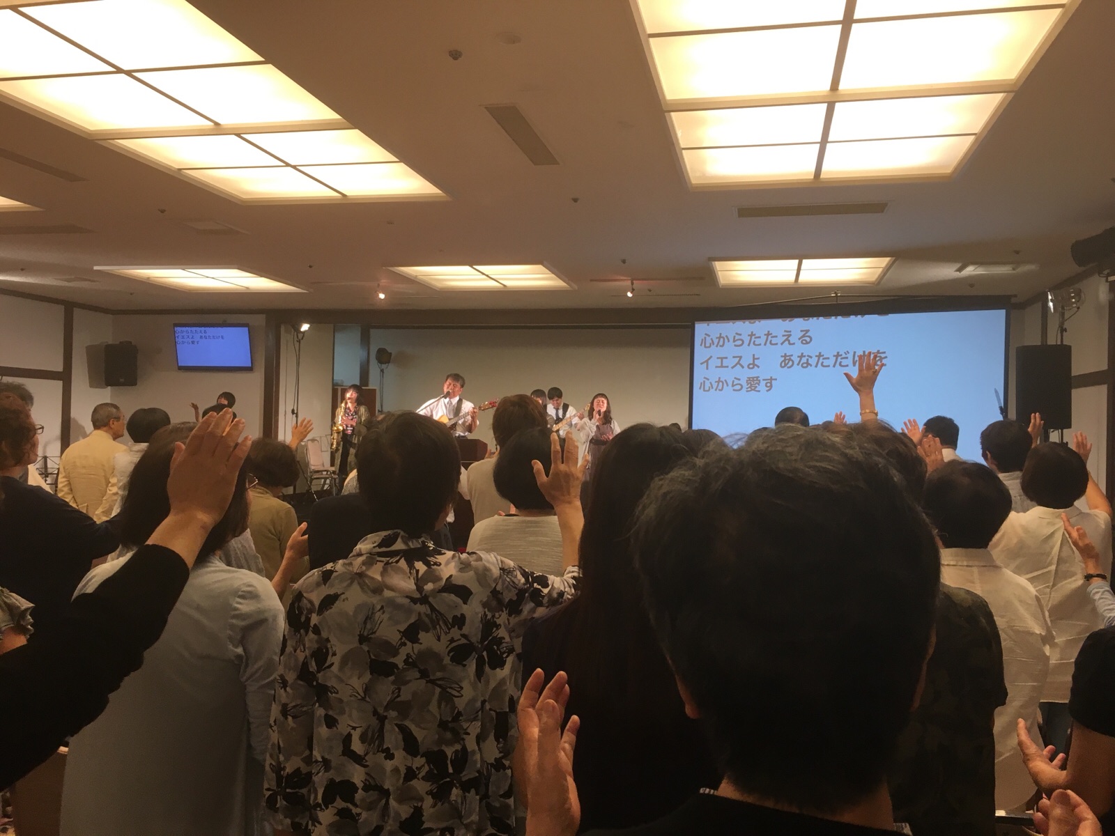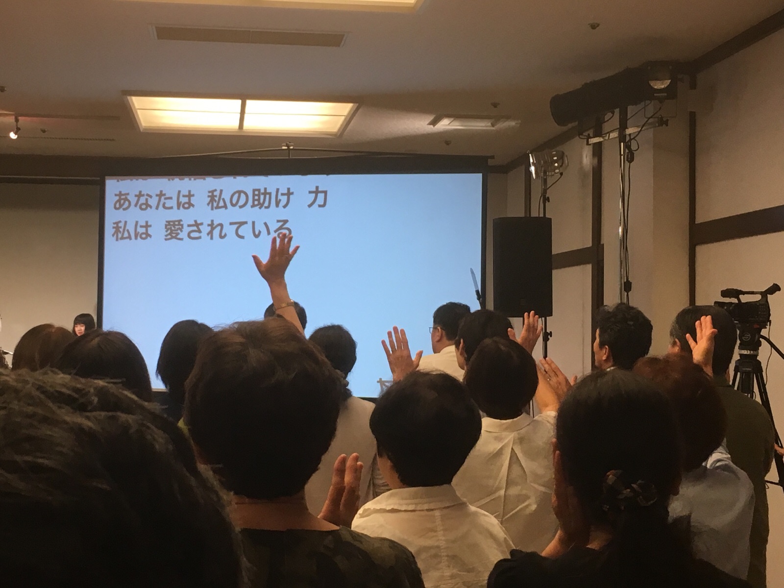 夜の聖会が始まり、ダビデ前田さんの導きで前半賛美がささげられています。