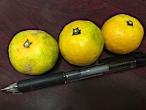 3個並べてもボールペンの長さにならないくらい小さいミカン。皮むきは手間ですが、味はとても美味しいです。