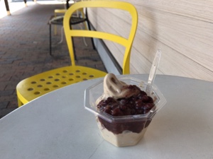 コーヒー味のソフトクリームにあずきが添えてあります。最初の一口目は勇気がいりますが、これが合うんです!