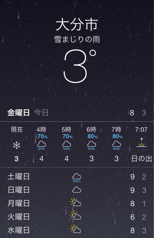 明日の大分は雪の予報!そして東京も大雪の予報! はたして無事に東京にたどり着けるか!お祈りして寝ます!
