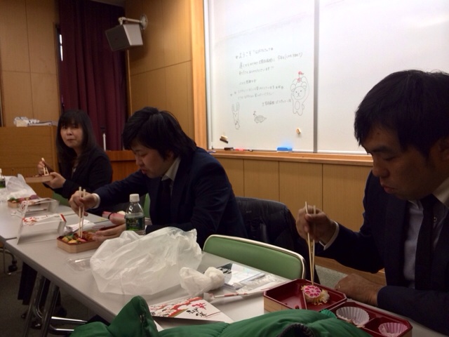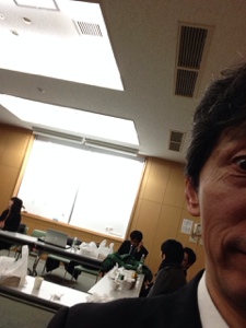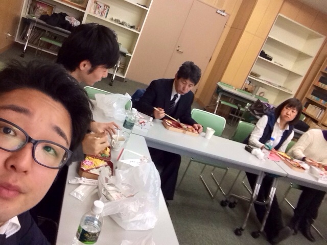 控え室で食事中です。