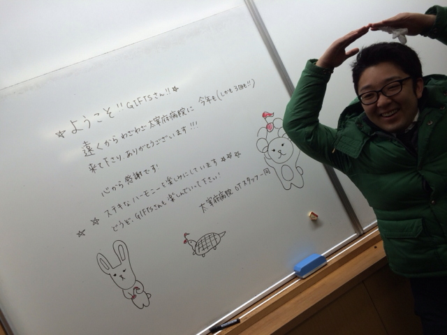 控え室にも、窓にGifts歓迎の言葉が書いてあります! 嬉しい!