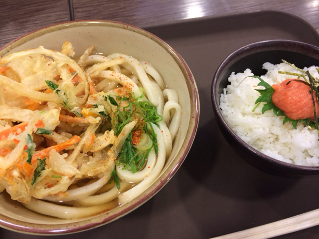 私、萱野はかき揚げうどんと明太ご飯です。