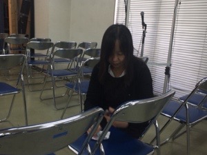 チラシ係の清水さん。 今日は奏楽をします。その為の準備中です。