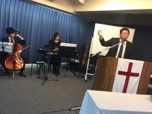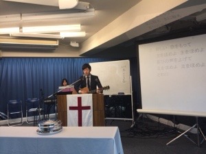 メッセージ前の賛美の時。 真境名さん、賛美を導いていきます。