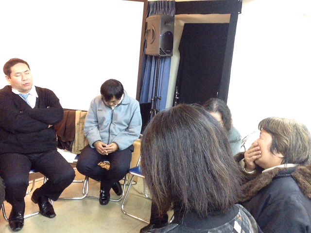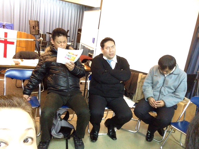 清水さんも加わり、4人で祈っています。 委員長は、こころごすぺるの撮影に行かれています。