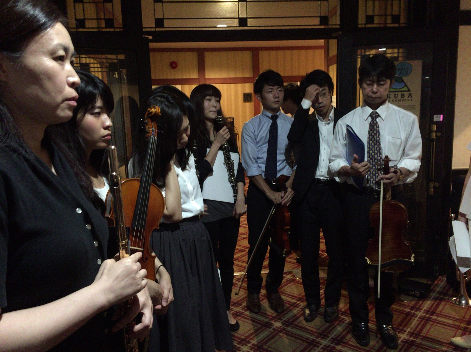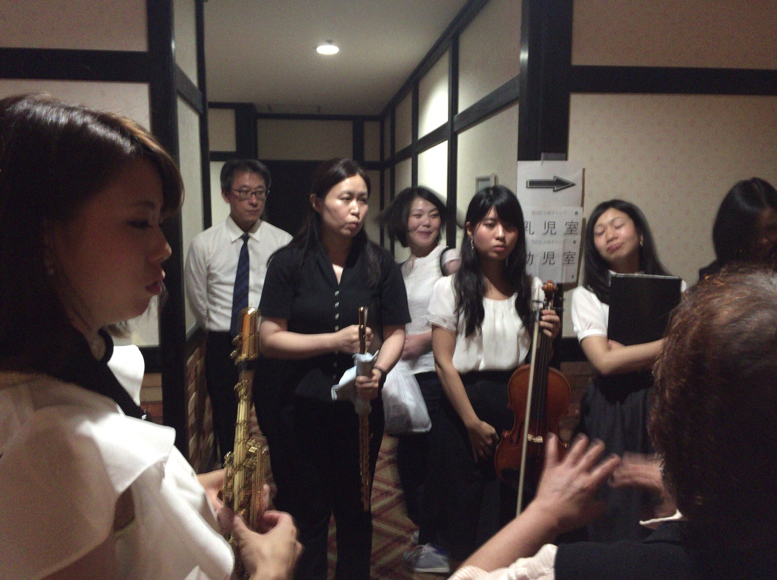 牧師賛美の前の舞台裏。廊下いっぱいに楽器を持ったメンバーが。