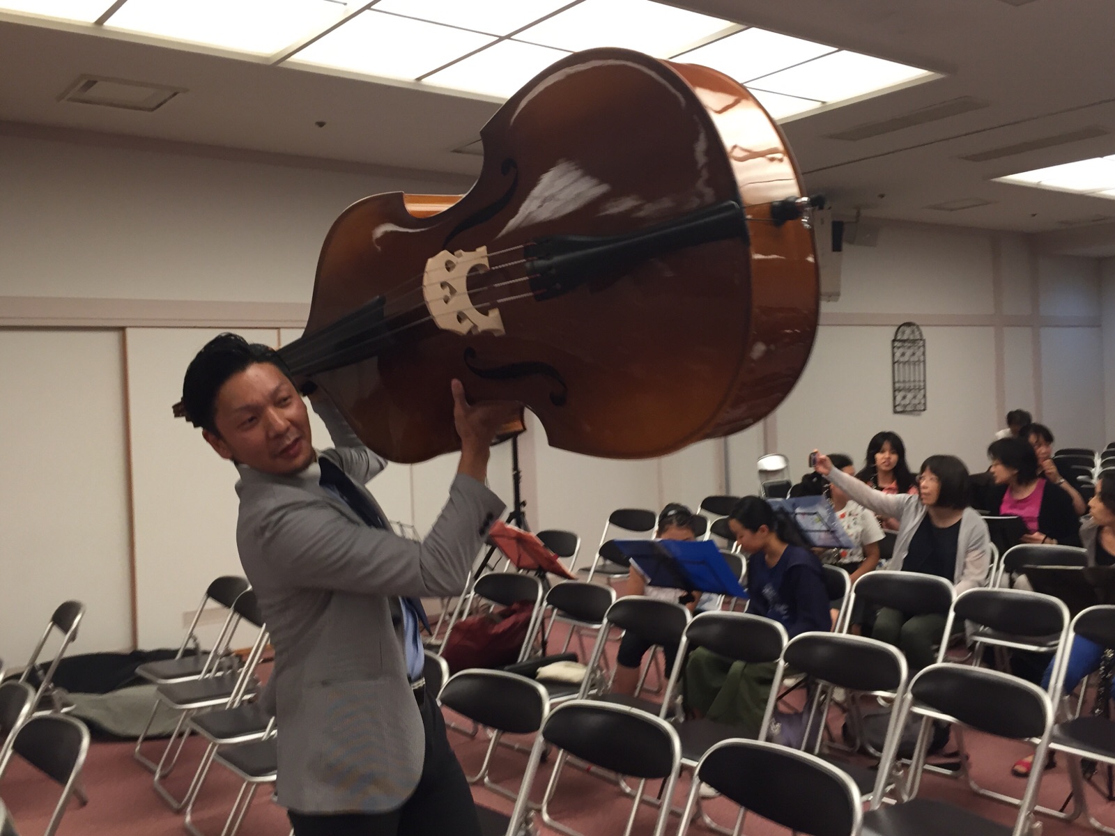 沢山の方々が集われました!コントラバスを軽々と持ち上げいざ、定位置へ!慣れた感じです♫