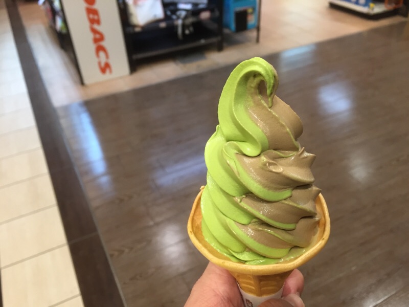 高坂インターの 抹茶&ほうじ茶ソフトクリーム。 甘さ控えめです。 アンテオケ2号車
