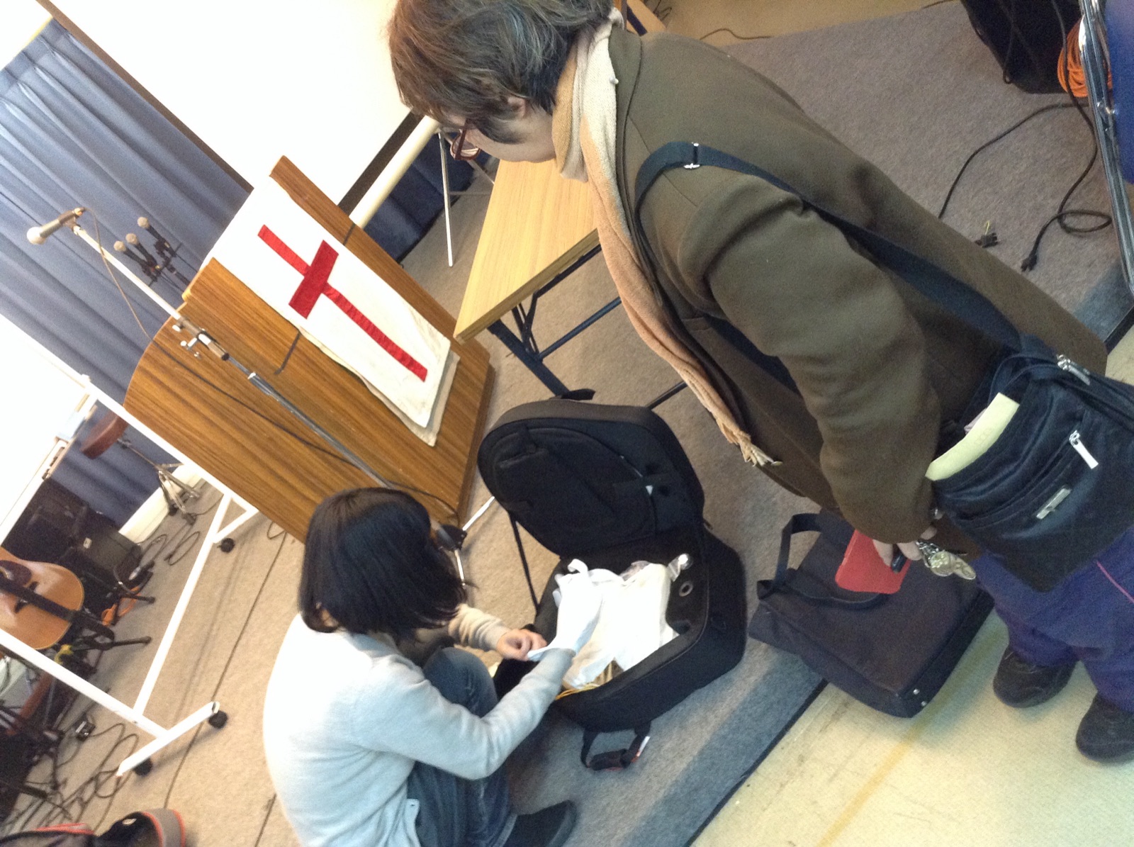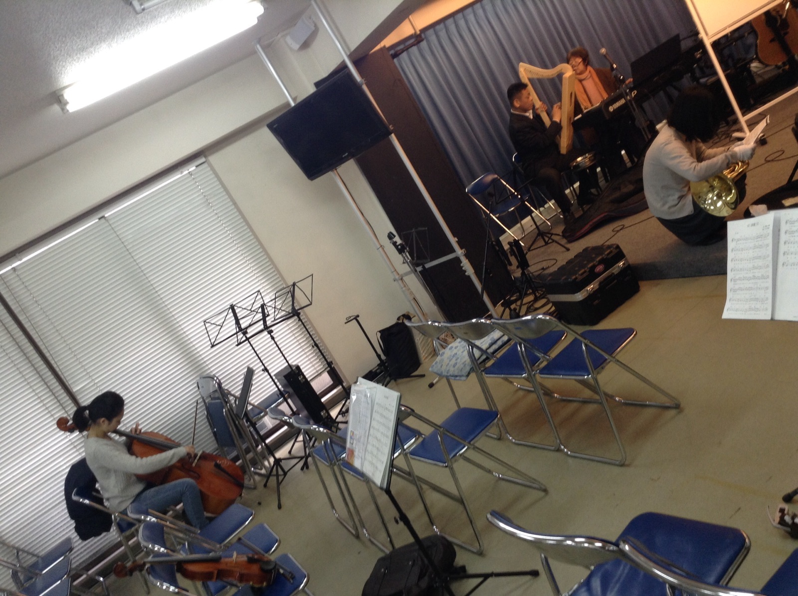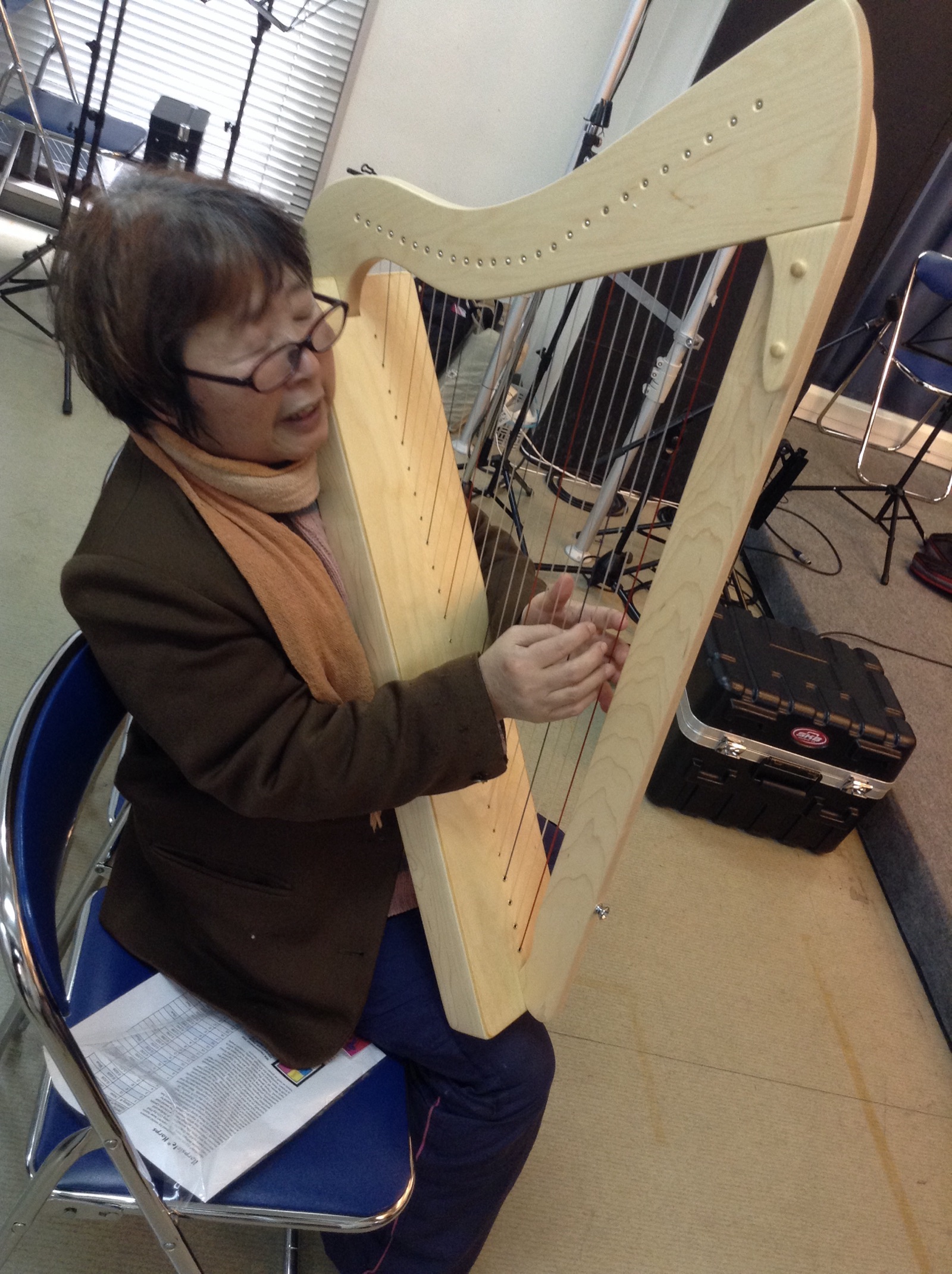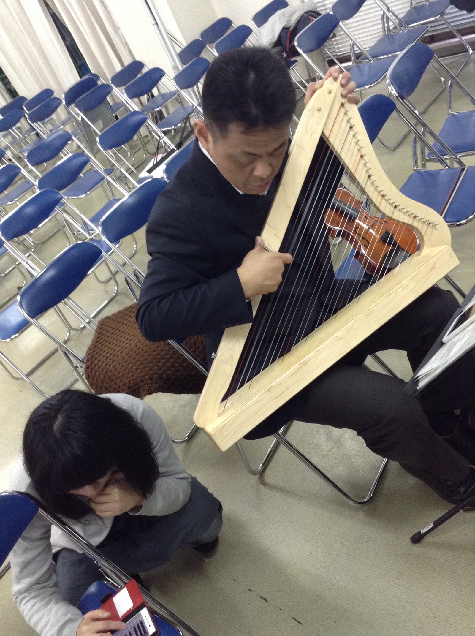 ハープをひかれる辻郷牧師。明日から早速使うそうな。マジですか?!わた