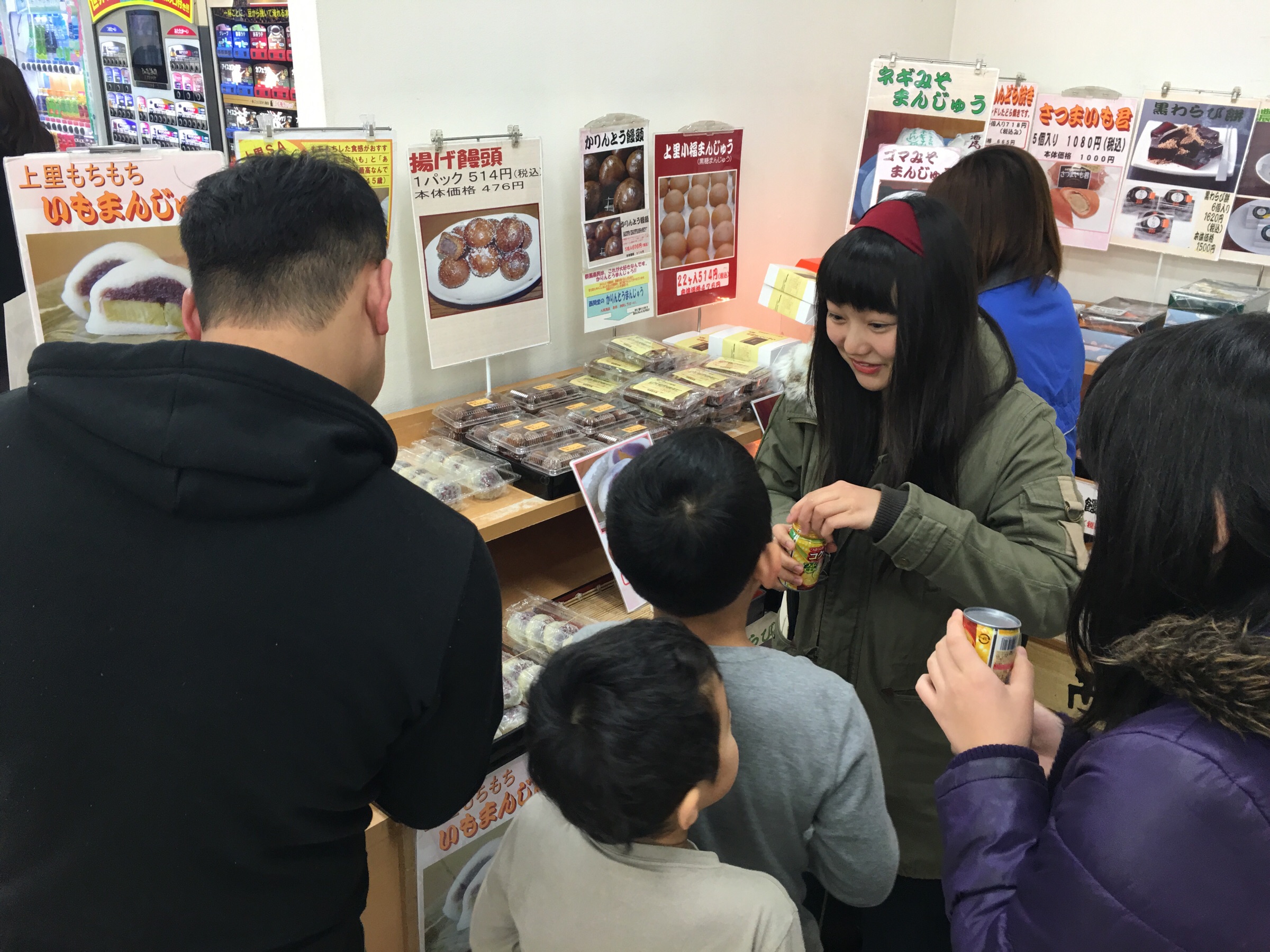 おまんじゅうを買おうか迷っているようです。 アンテオケバス1号車