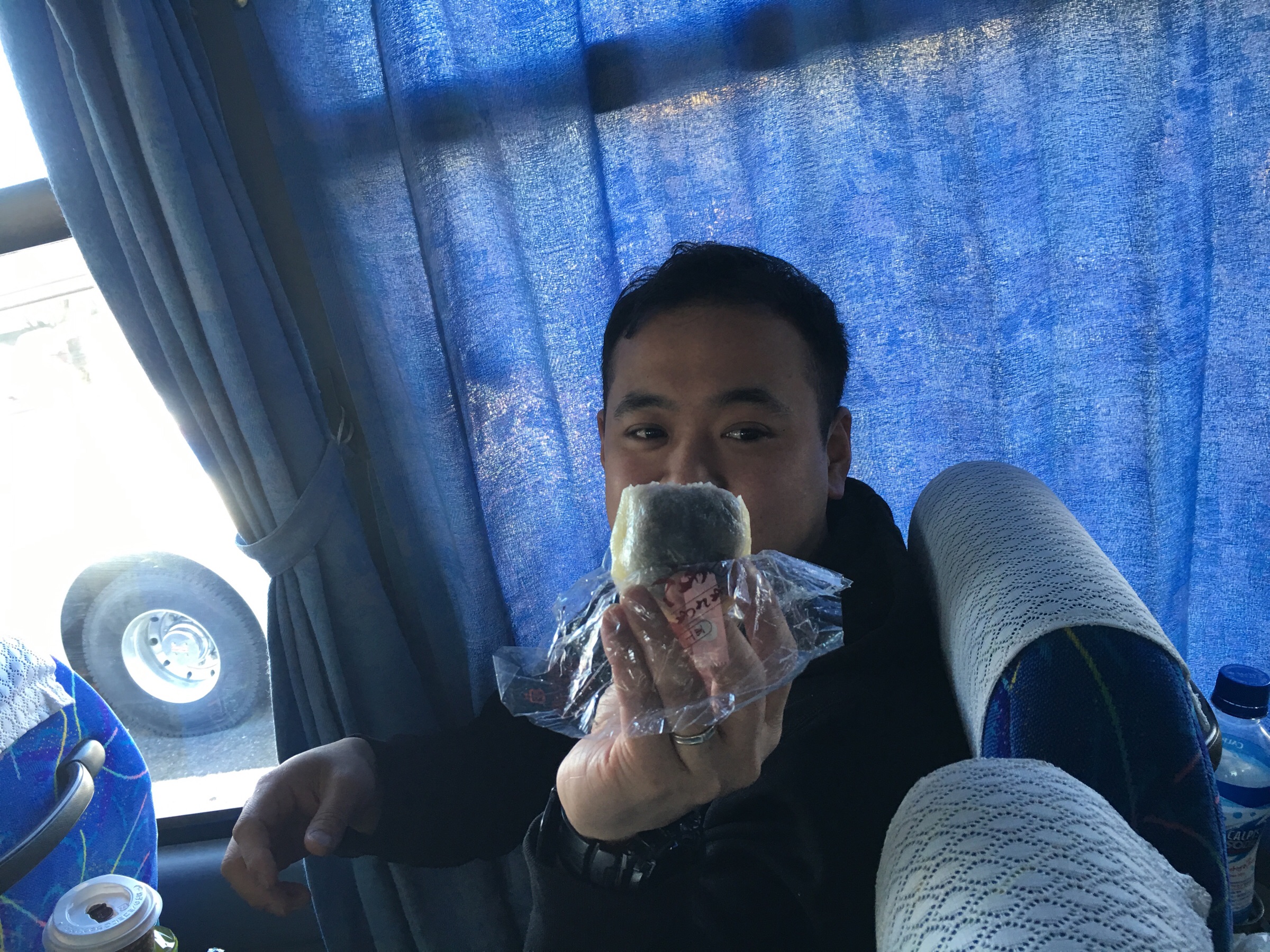 ジョセフ前田さん、迷った末、おまんじゅうゲット!三本松さんにあんぱんも撮ってと言われて2ショットです! アンテオケバス 1号車