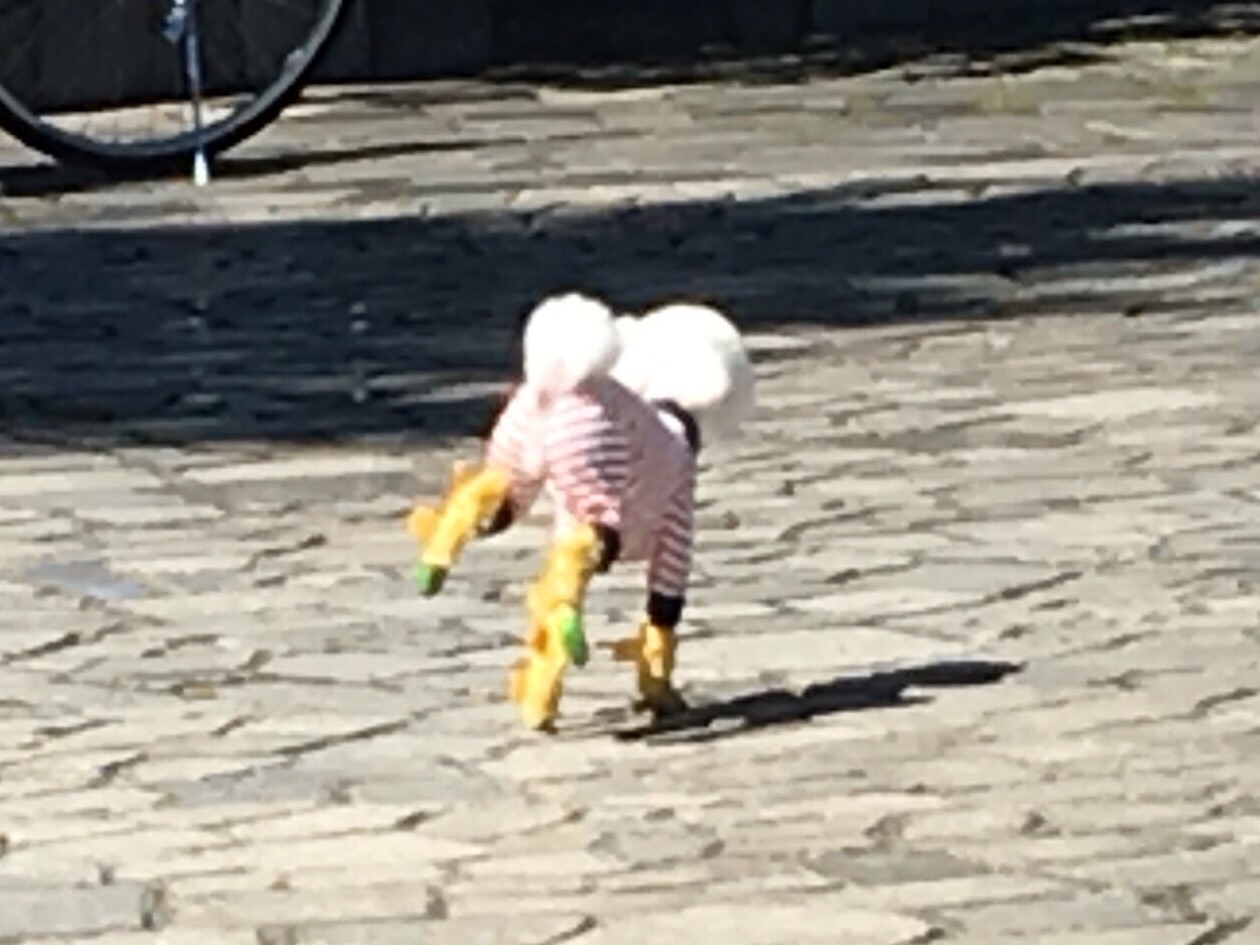 靴下と靴を履いたイヌが散歩してました。長靴を履いた猫・・のお話は知ってますが。