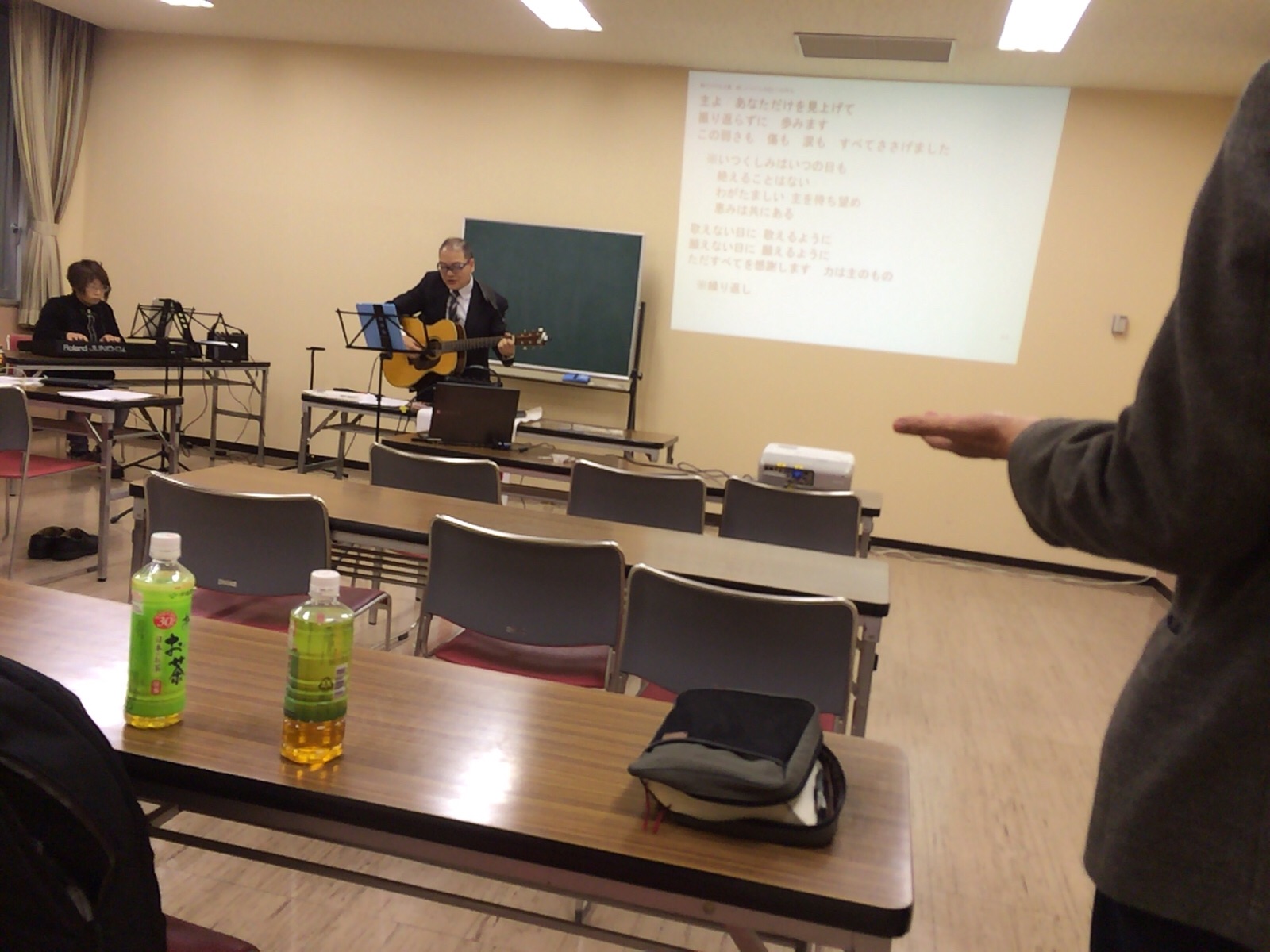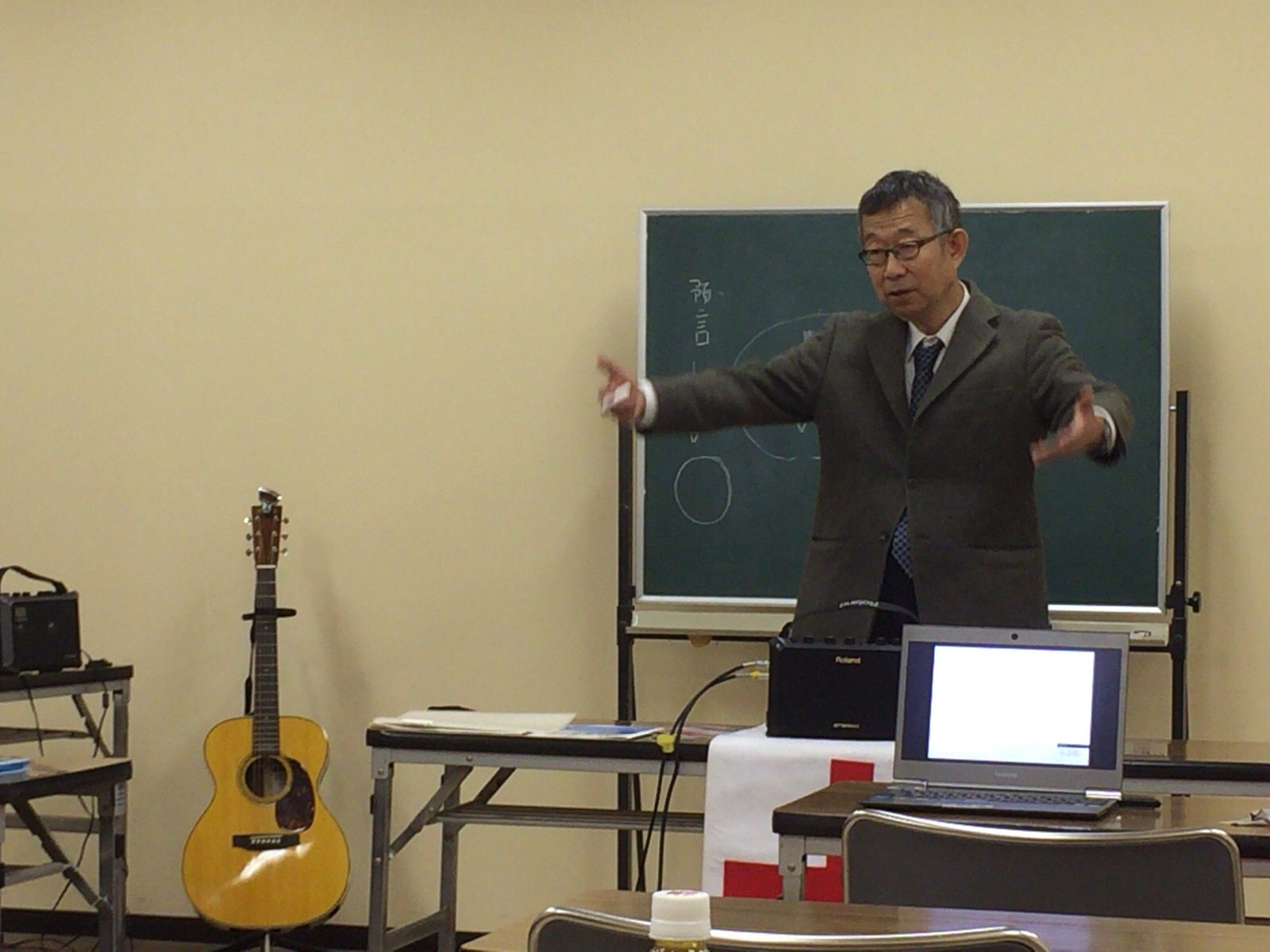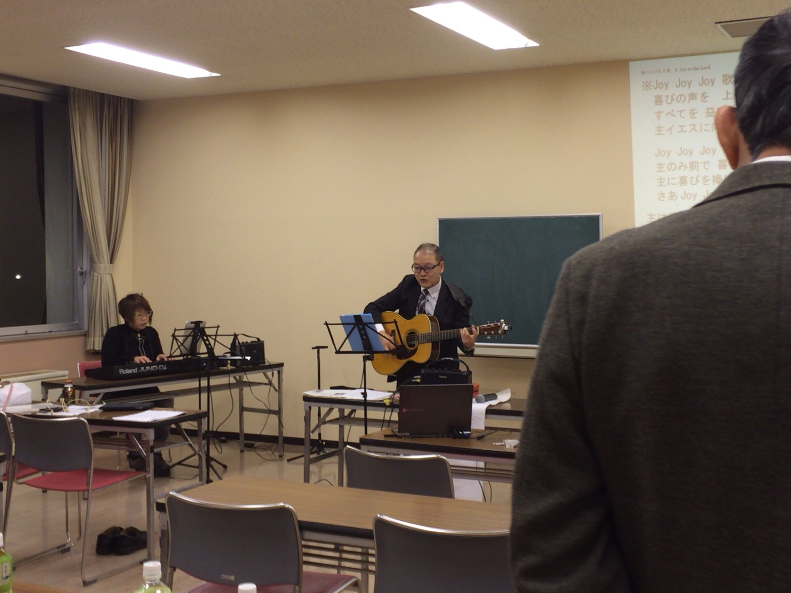 柏崎聖会がスタート。 賛美を導くのは柏崎教会牧師の中村さん。