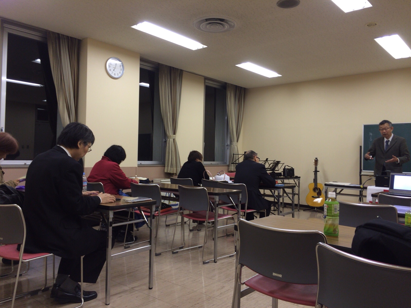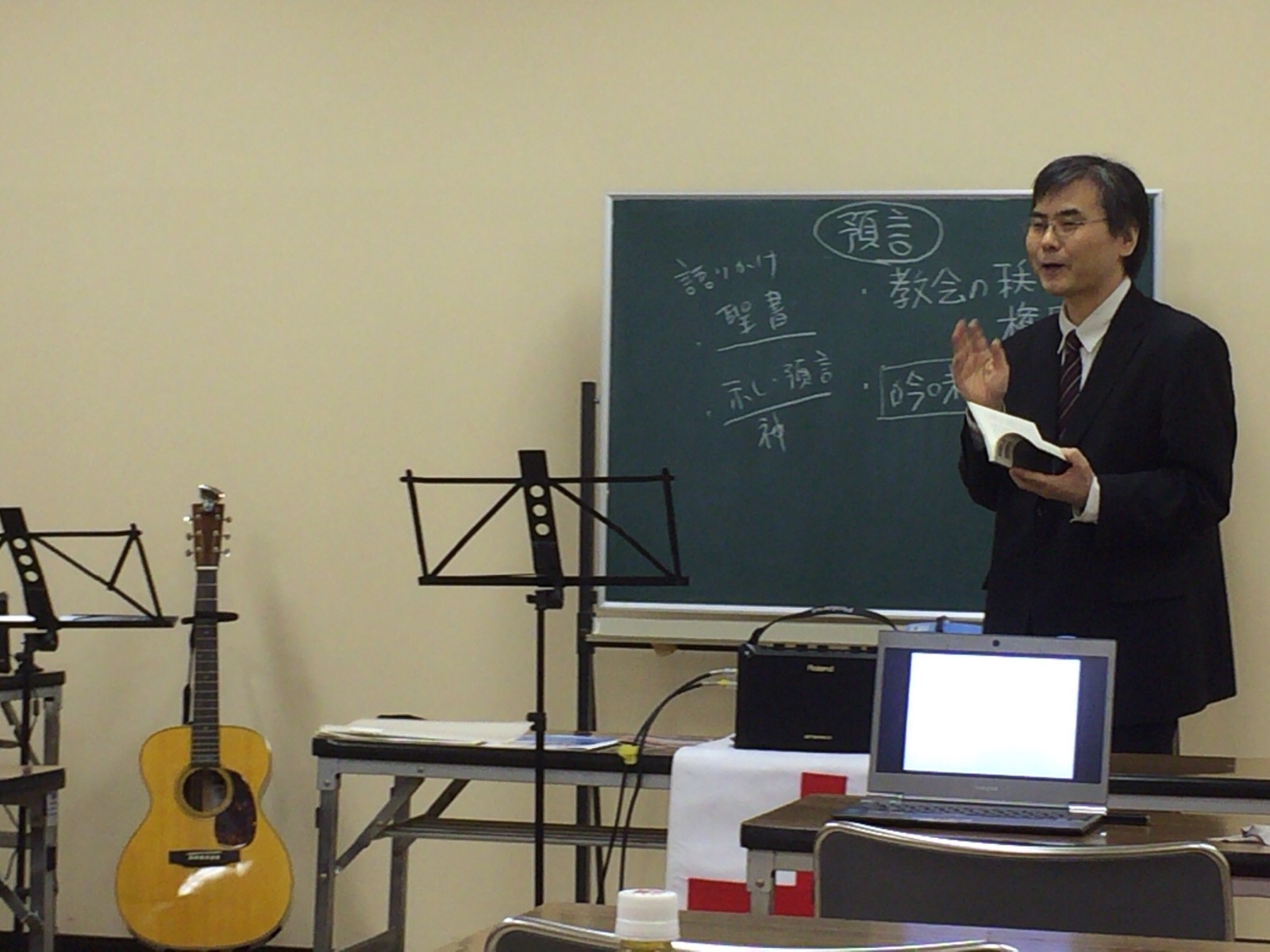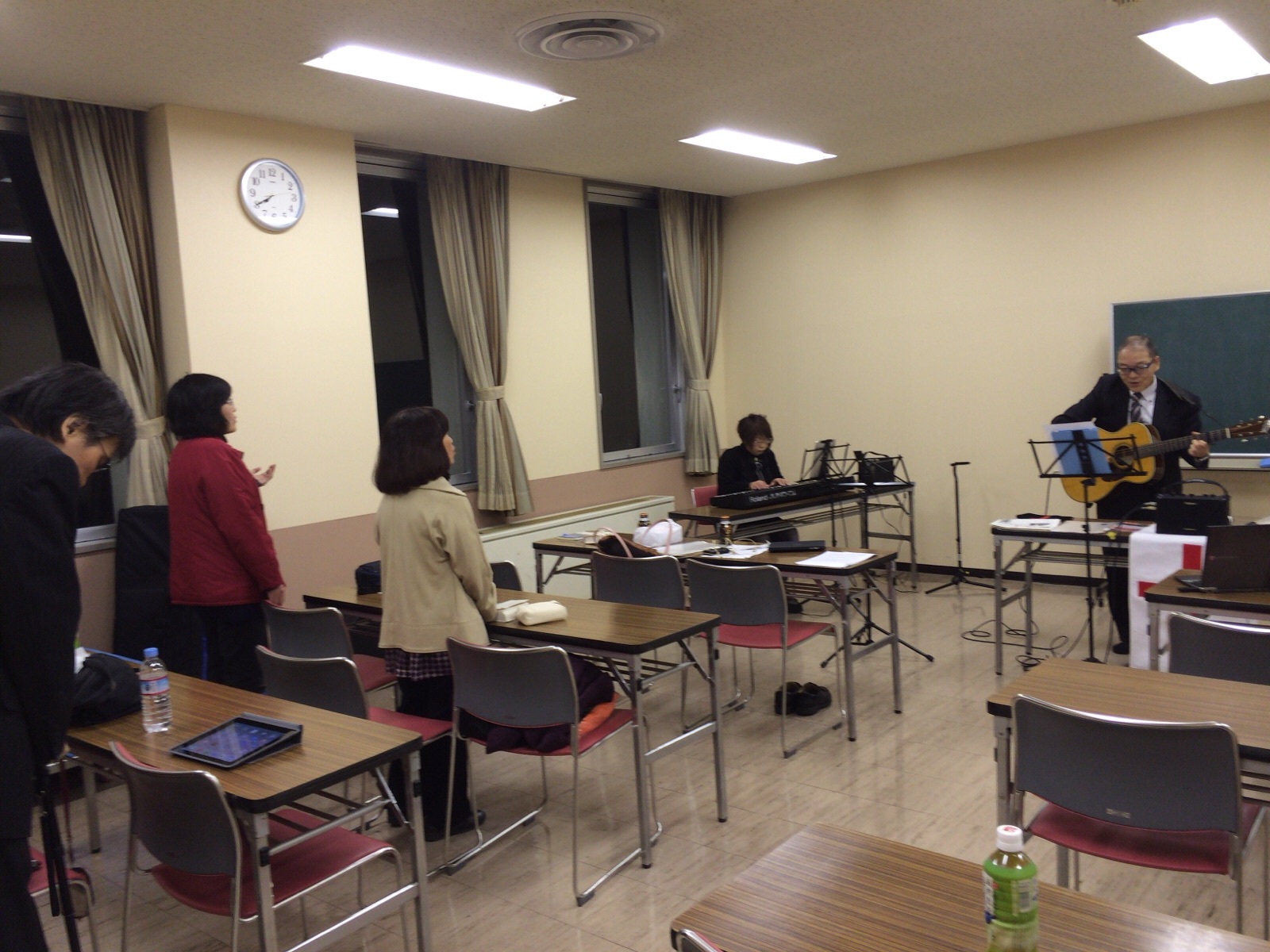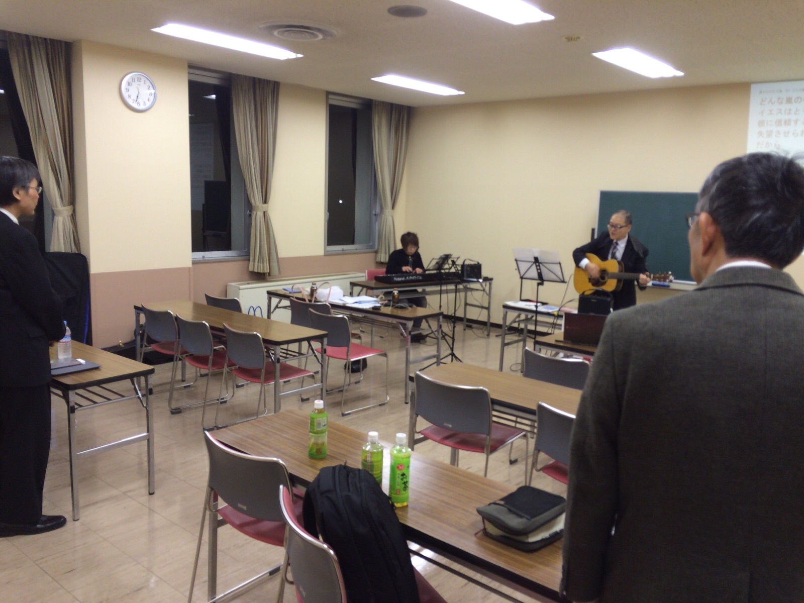 柏崎聖会がスタート。 賛美を導くのは柏崎教会牧師の中村さん。