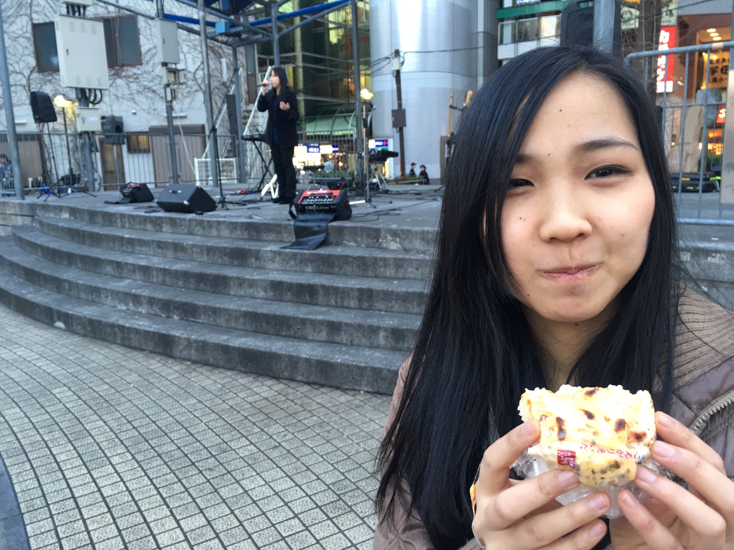 義姉ちゃんが歌っている前で、エビドリアおにぎり食べてます。