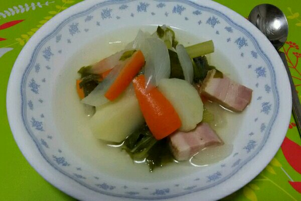 今晩のメインは、温かいポトフです。野菜もベーコンも、大きく切るから楽〜。(笑)