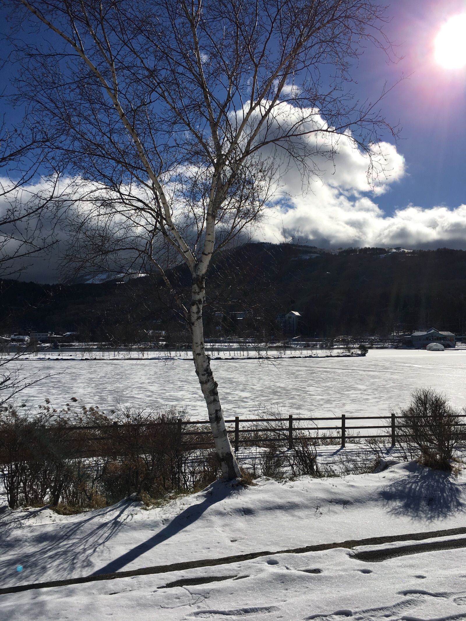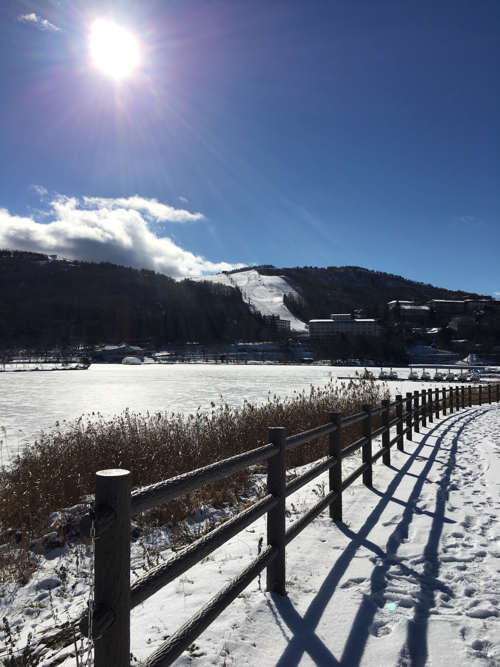 今日は長野県の上田市でライブを行います! いま白樺湖まで来ました。きれいです! 湖面は凍結、スキー場も見えます!