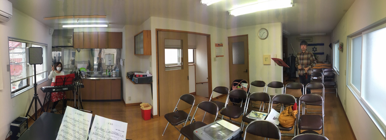 今日は教会で、路上ライブチームで新曲の練習です! 教会会堂を目一杯使ってます! 聖なる神の都エルサレム教会(弘前)